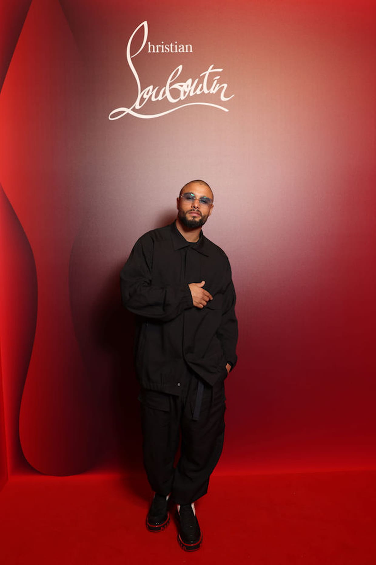 Sadeck en chemise noire ample et pantalon cargo à l'événement Louboutin