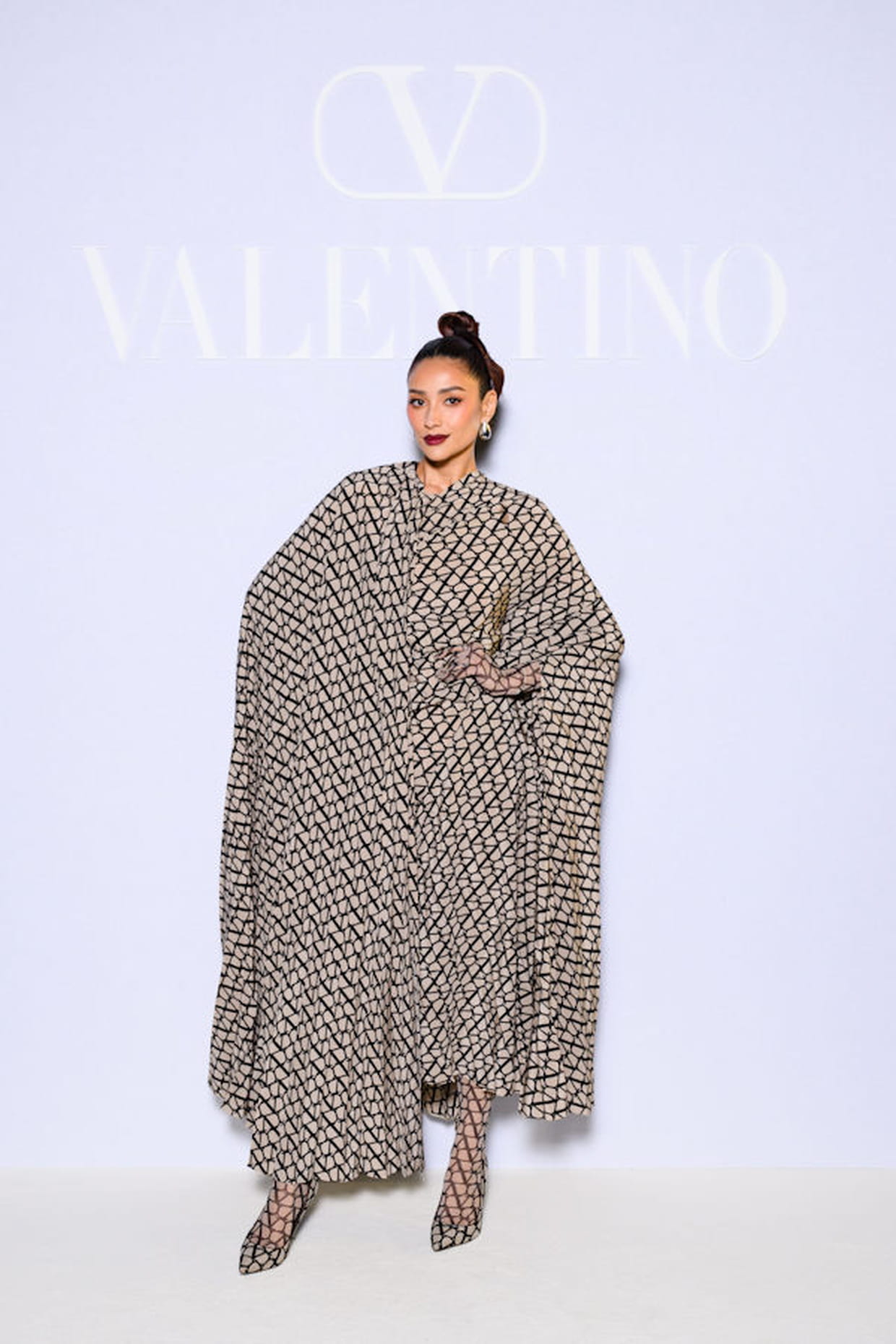 Shay Mitchell en robe oversize à imprimé et talons assortis au défilé Valentino