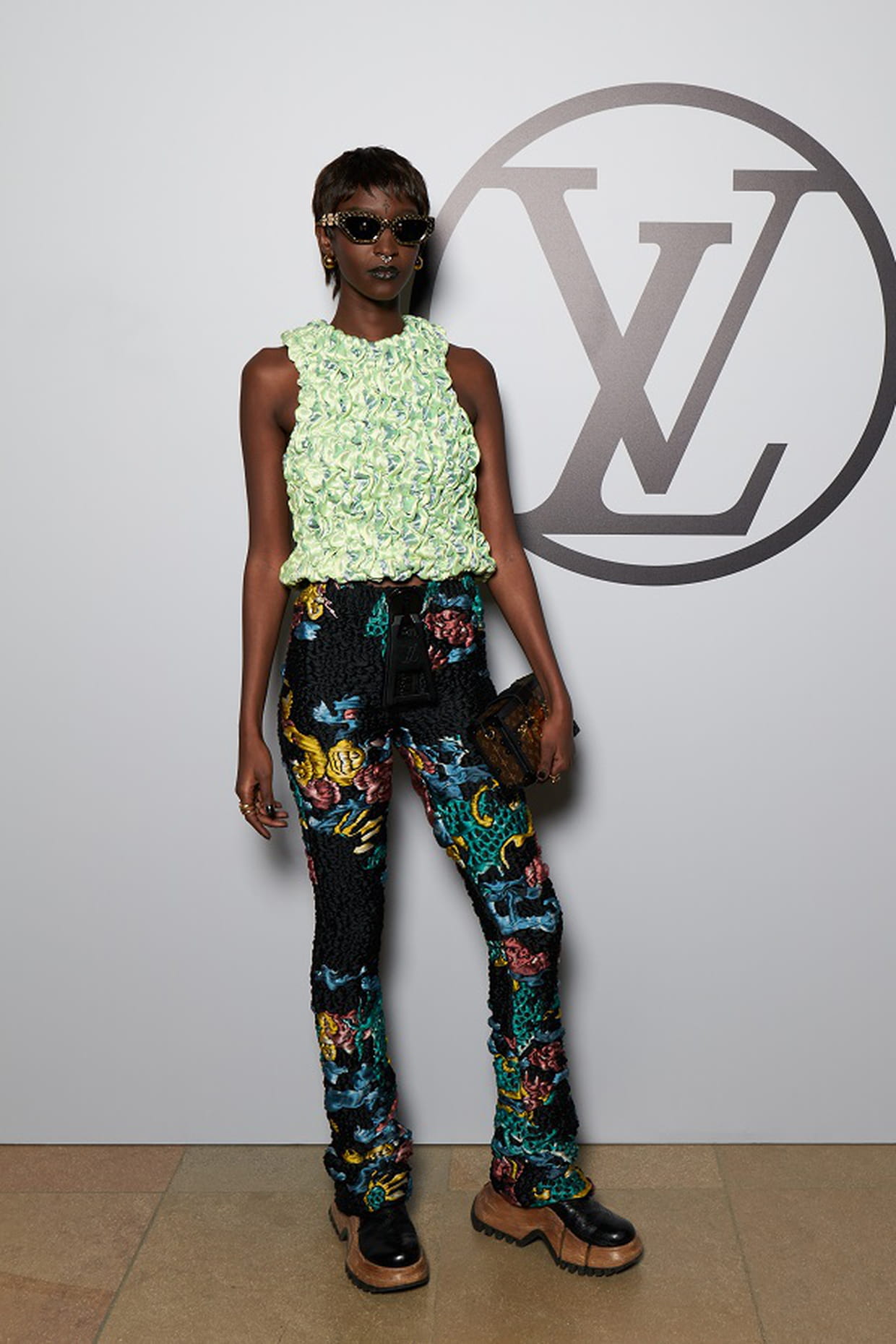 Lous and the Yakuza en top vert texturé et pantalon taille haute flare imprimé fleuri au défilé Louis Vuitton pendant la Fashion week automne-hiver 2023-2024 à Paris le 6 mars 2023.