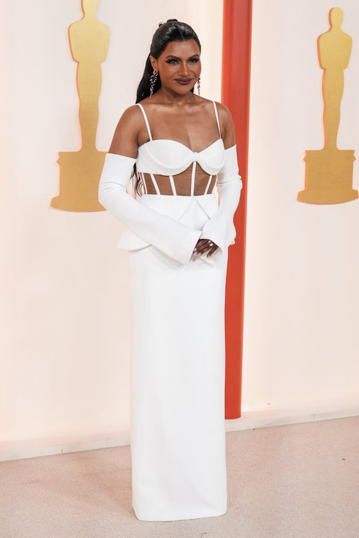 Mindy Kaling en robe blanche à détails bustier Vera Wang à la 95ème cérémonie des Oscars au Dolby Theatre à Los Angeles le 12 mars 2023.
