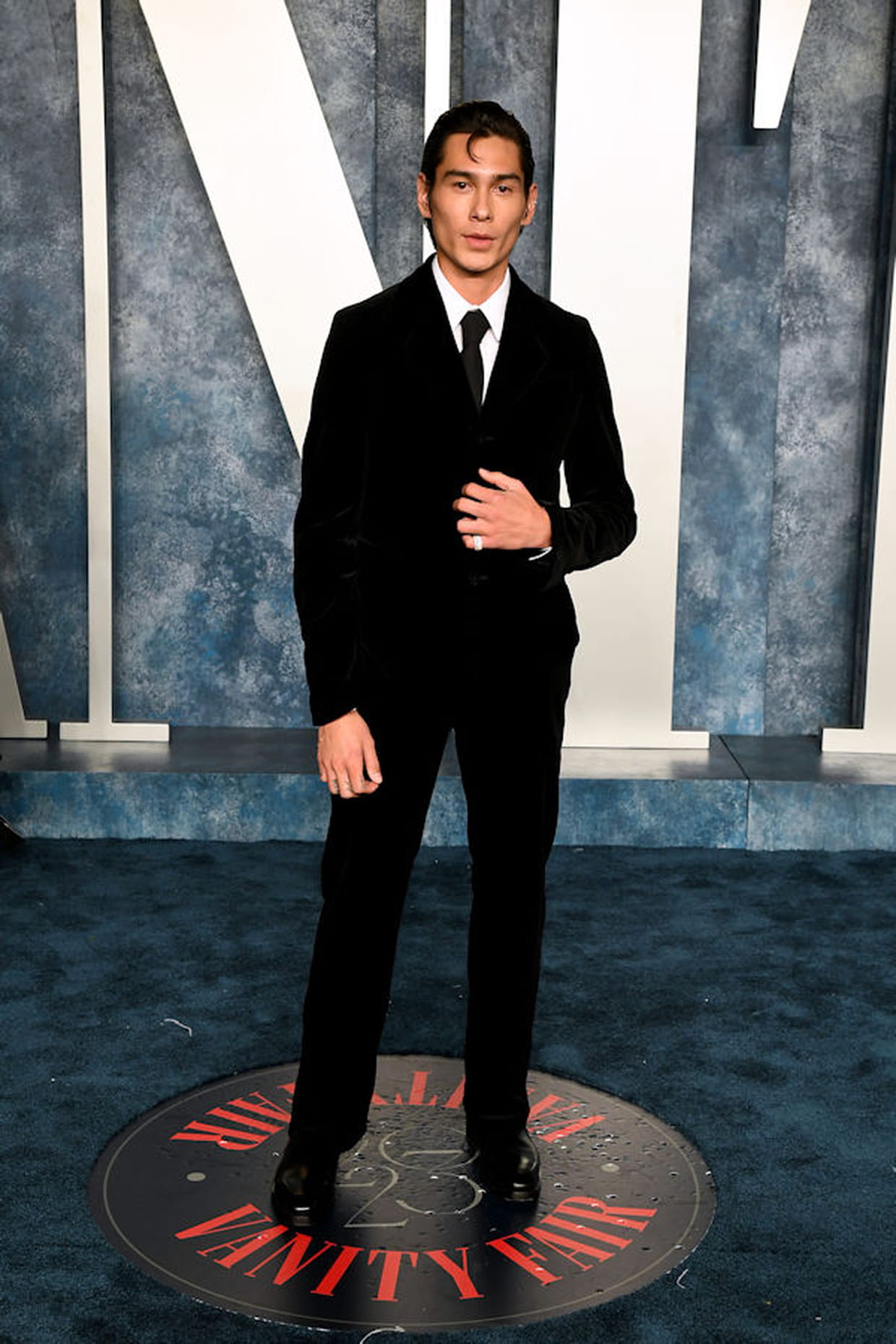 Evan Mock en costume noir en velours Ferragamo à l'after party des Oscars organisée par Vanity Fair au Wallis Annenberg Center for the Performing Arts à Beverly Hill le 12 mars 2023.