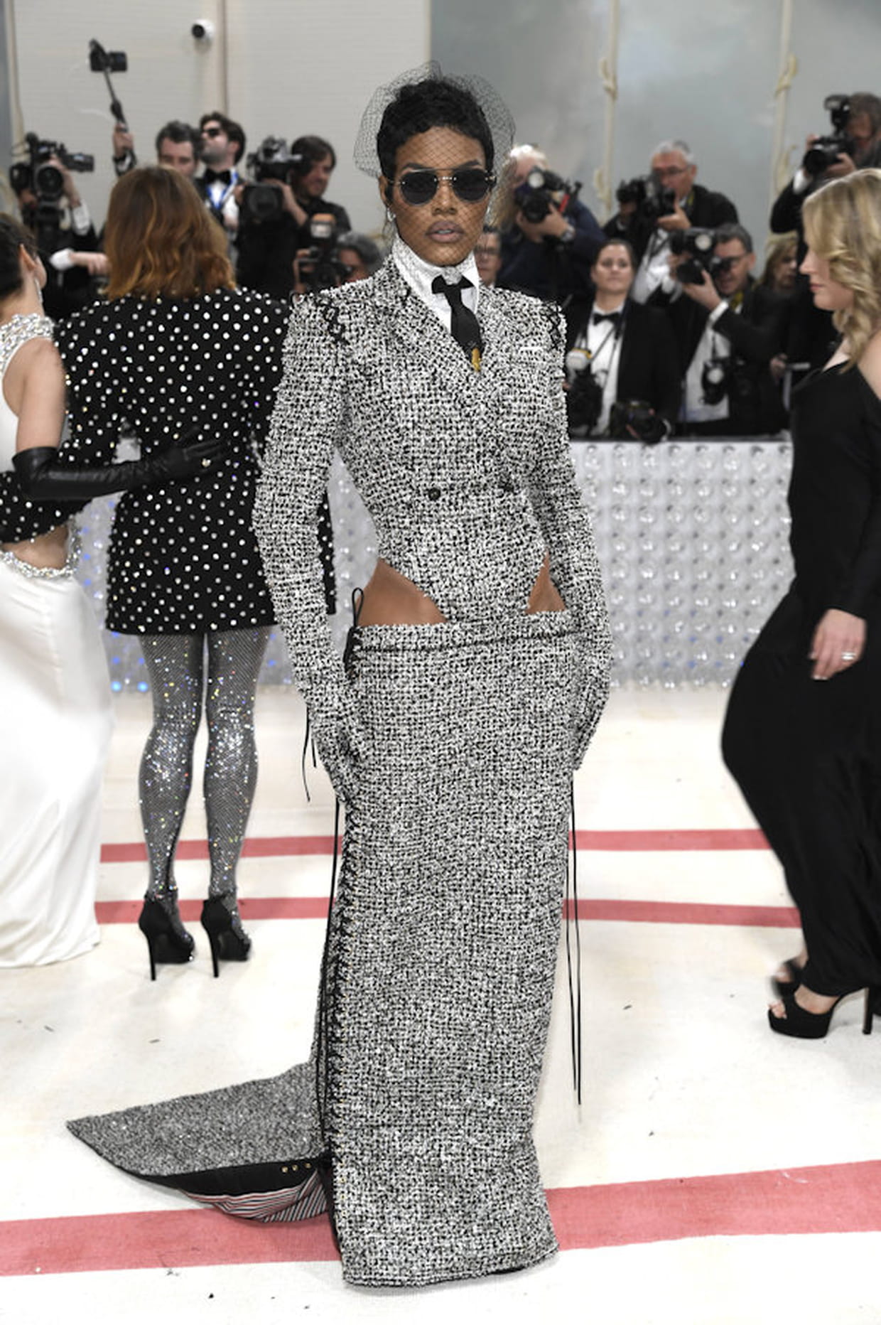 Teyana Taylor en robe grise en tweed Thom Browne lors du Met Gala au Metropolitan Museum of Art de New York le 1er mai 2023.