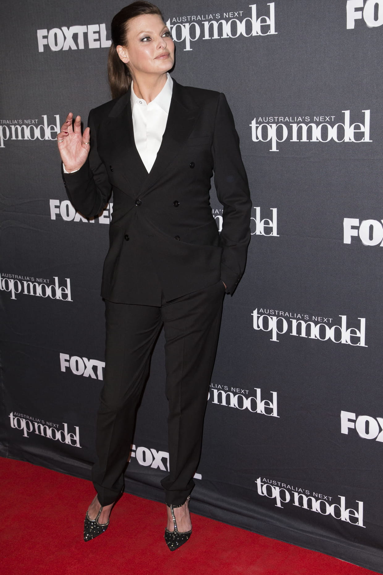 Linda Evangelista en tailleur noir élégant lors de la soirée de tournage de l'émission Next Top Model en Australie le 29 octobre 2014.