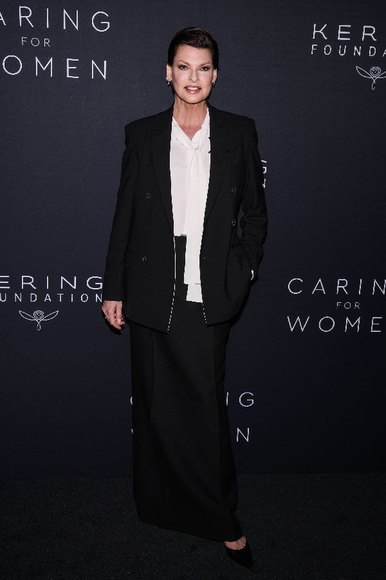 Linda Evangelista en blouse à col lavallière et ensemble noir lors d'un dîner à la fondation Kering à New York le 12 septembre 2023.