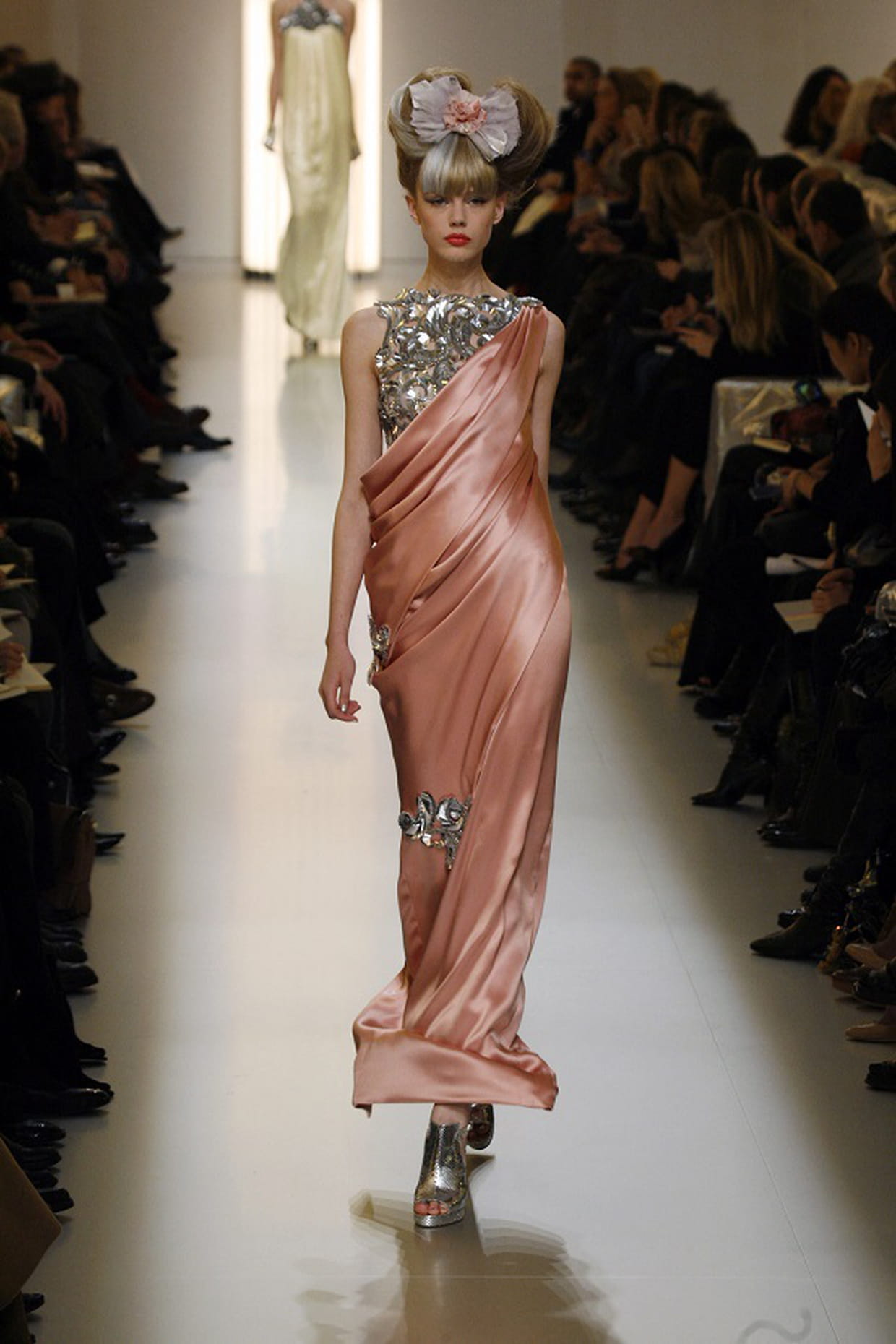 Silhouette en robe longue satinée rose ornée de bijoux au défilé Chanel haute couture printemps-été 2010 à Paris le 26 janvier 2010.