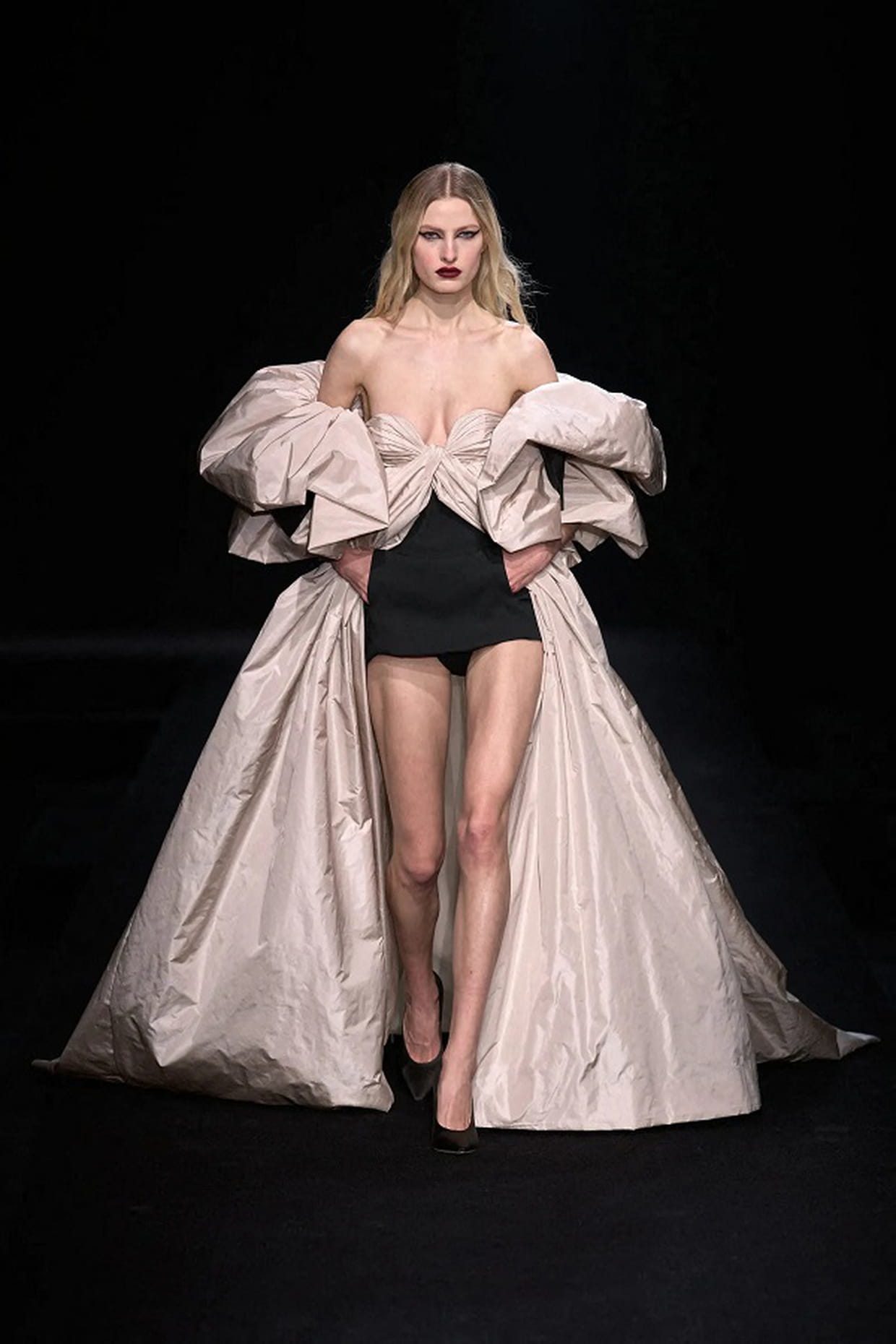 Silhouette en minijupe noire et bustier XXL beige à traîne Valentino du défilé Valentino pendant la Fashion week haute couture printemps-été 2023 à Paris le 25 janvier 2023.