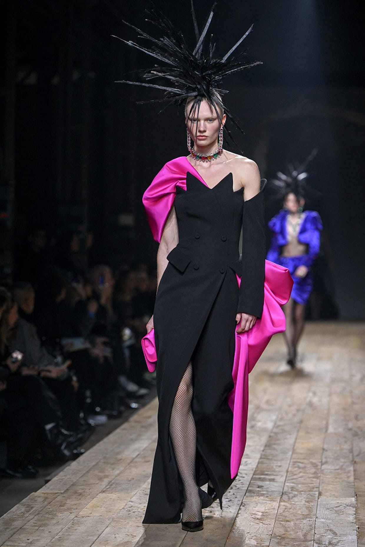 Silhouette en robe bustier noire fendue et empiècements roses au défilé Moschino pendant la Fashion week automne-hiver 2023-2024 à Milan le 23 février 2023.
