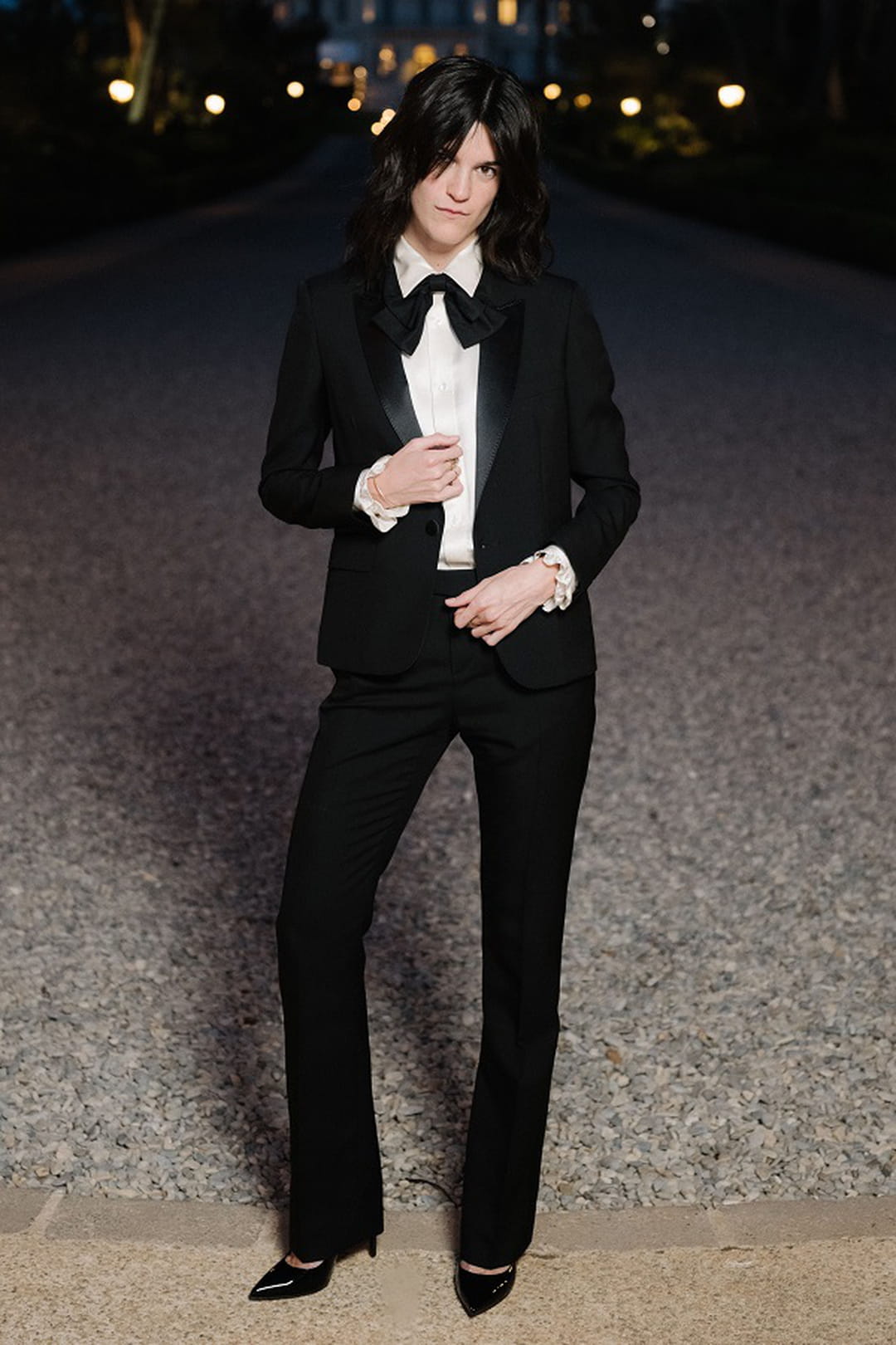 La fille des comédien-ne-s Sandrine Kiberlain et Vincent Lindon a pris la pose dans l'allée de l'hôtel du Cap-Eden-Roc éclairée par les lumières de la soirée. Habillée en total look Celine, Suzanne Lindon portait un blazer noir à revers brillants, un pantalon de costume slim, une chemise blanche à froufrous et un nœud papillon tombant. Pour parfaire son look boyish, elle a opté pour une paire d'escarpins vernis à bouts pointus et un fin bracelet doré.