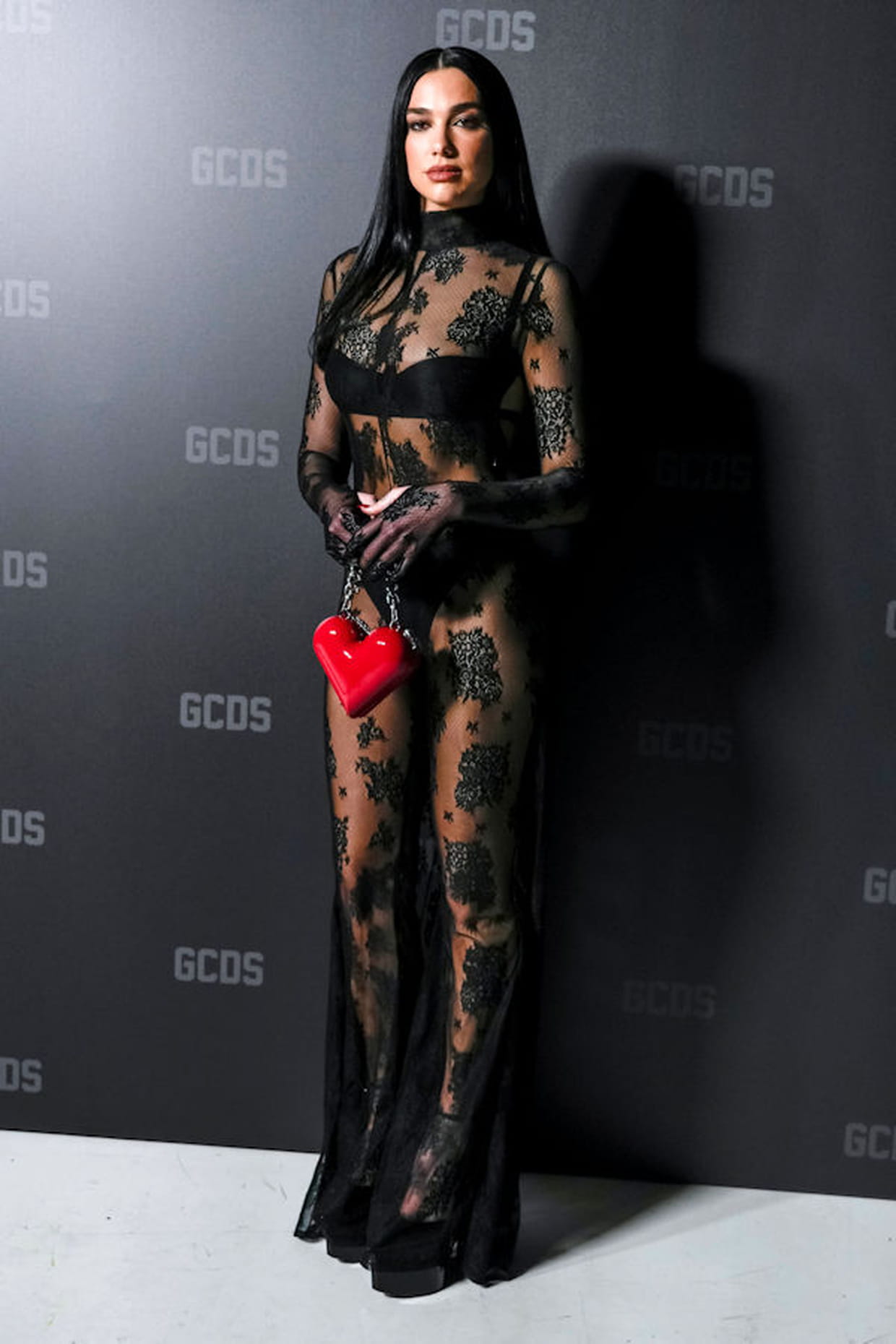 Dua Lipa en longue robe en dentelle et ensemble de sous-vêtements noirs au défilé GCDS pendant la Fashion week automne-hiver 2023-2024 à Milan le 23 février 2023.