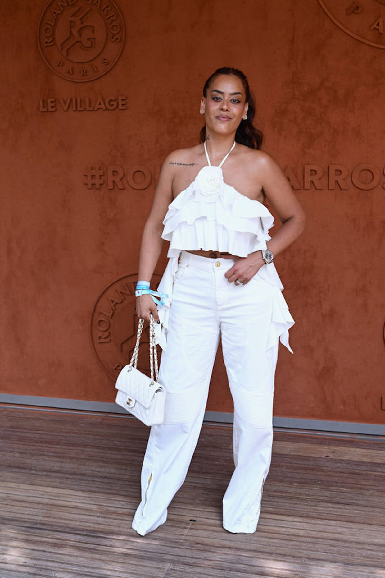 Amel Bent en top volanté à fleur XXL et pantalon blanc Blumarine au tournoi de Roland-Garros à Paris le 10 juin 2023.