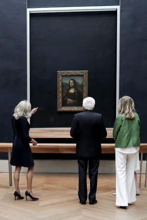 Que ce soit pour célébrer le millénaire de l'abbaye du Mont Saint-Michel ou pour admirer les peintures de la Renaissance, la première dame n'a qu'un seul mot d'ordre : être chic en toutes circonstances. Devant la pyramide la plus célèbre du monde, Brigitte Macron était habillée d'une courte robe bleu marine, à boucles dorées et à manches longues, signée Louis Vuitton. Pour parfaire son look, elle avait assorti cette pièce à une paire d'escarpins pointus en daim, ainsi qu'à un bracelet et un collier discret.