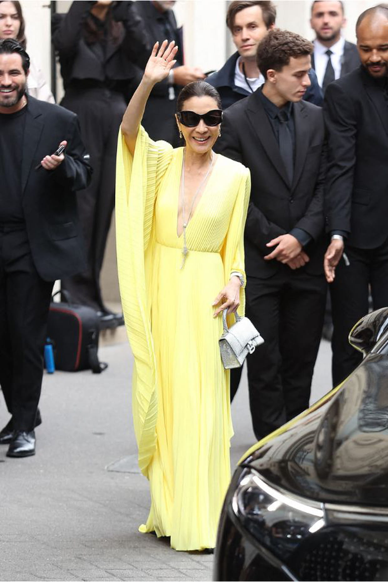 Michelle Yeoh en robe plissée jaune au défilé Balenciaga haute couture automne-hiver 2023-2024