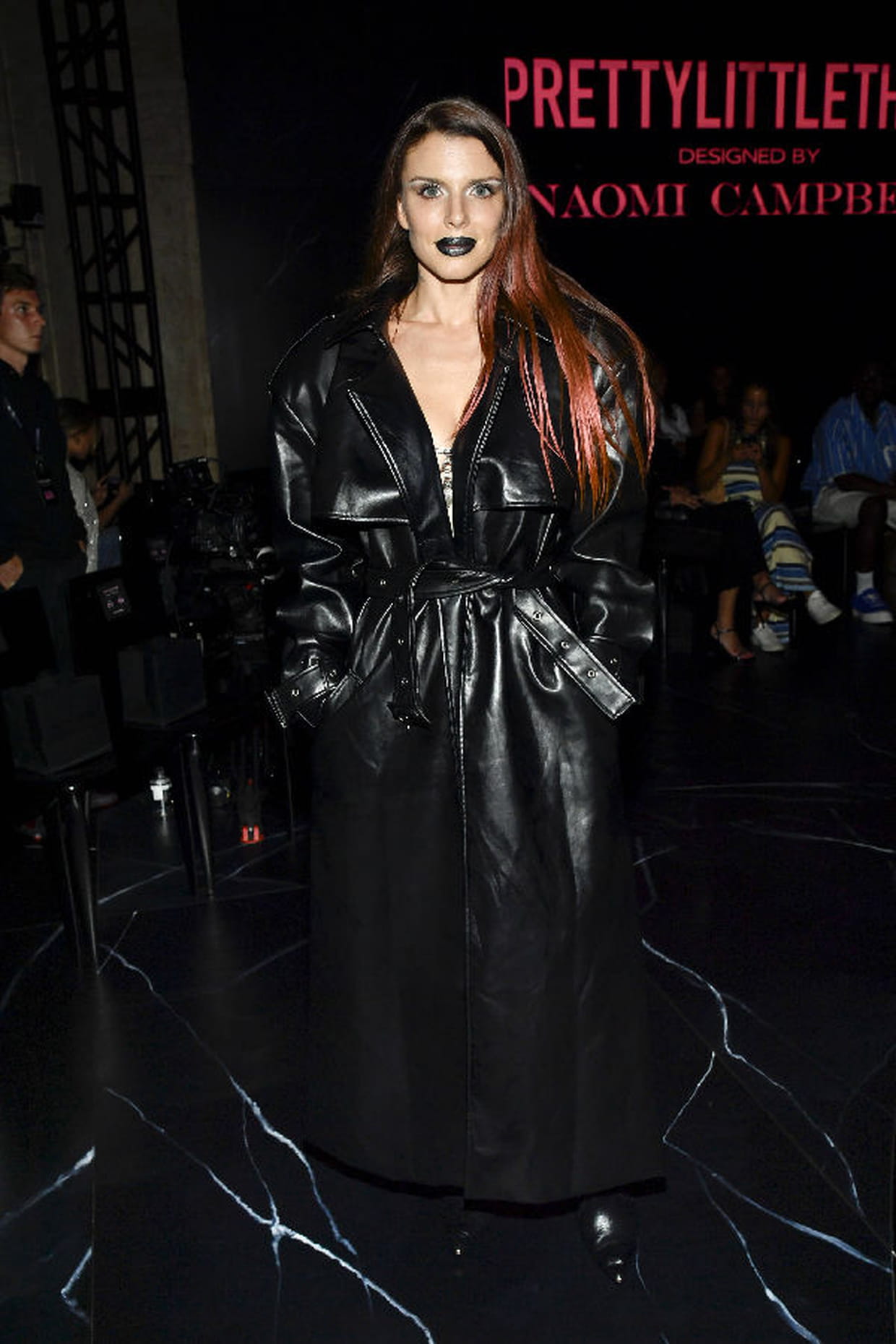 Julia Fox en long manteau noir ciré au défilé PrettyLittleThing x Naomi Campbell printemps-été 2024