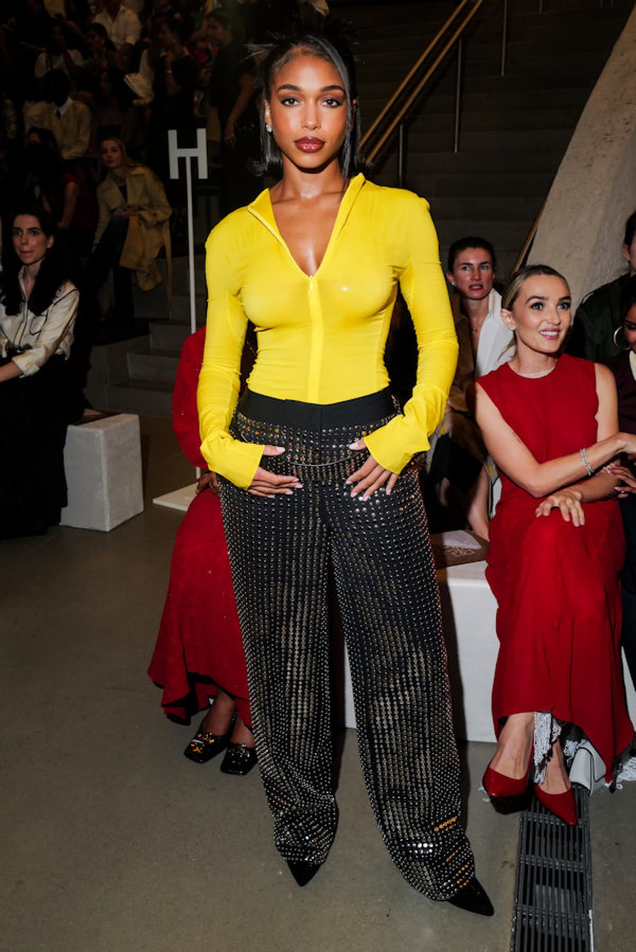 Lori Harvey en top jaune et pantalon clouté au défilé Tory Burch printemps-été 2024