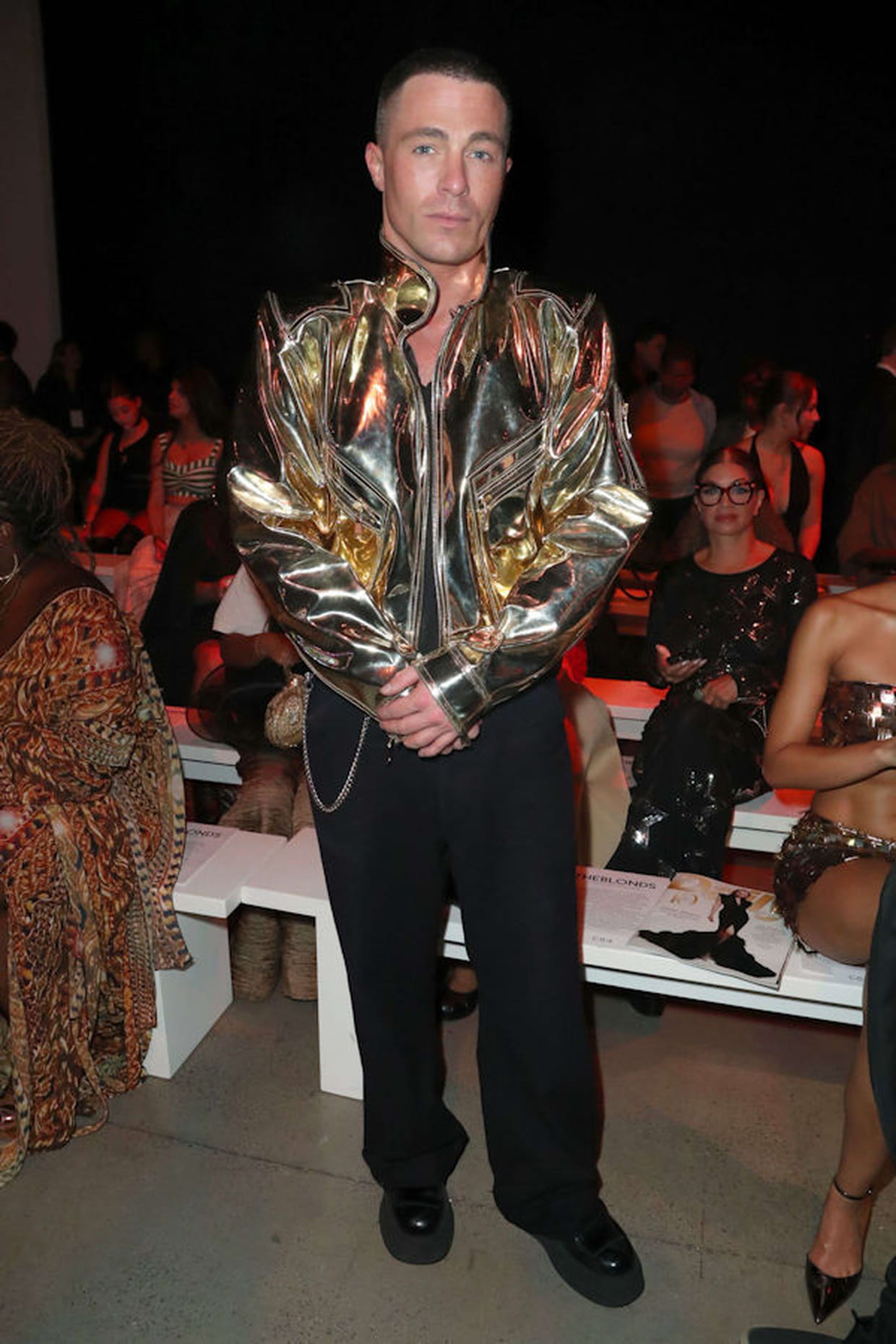 Colton Haynes en veste dorée métallisée et pantalon noir au défilé The Blonds printemps-été 2024 pendant la Fashion week à New York le 13 septembre 2023.