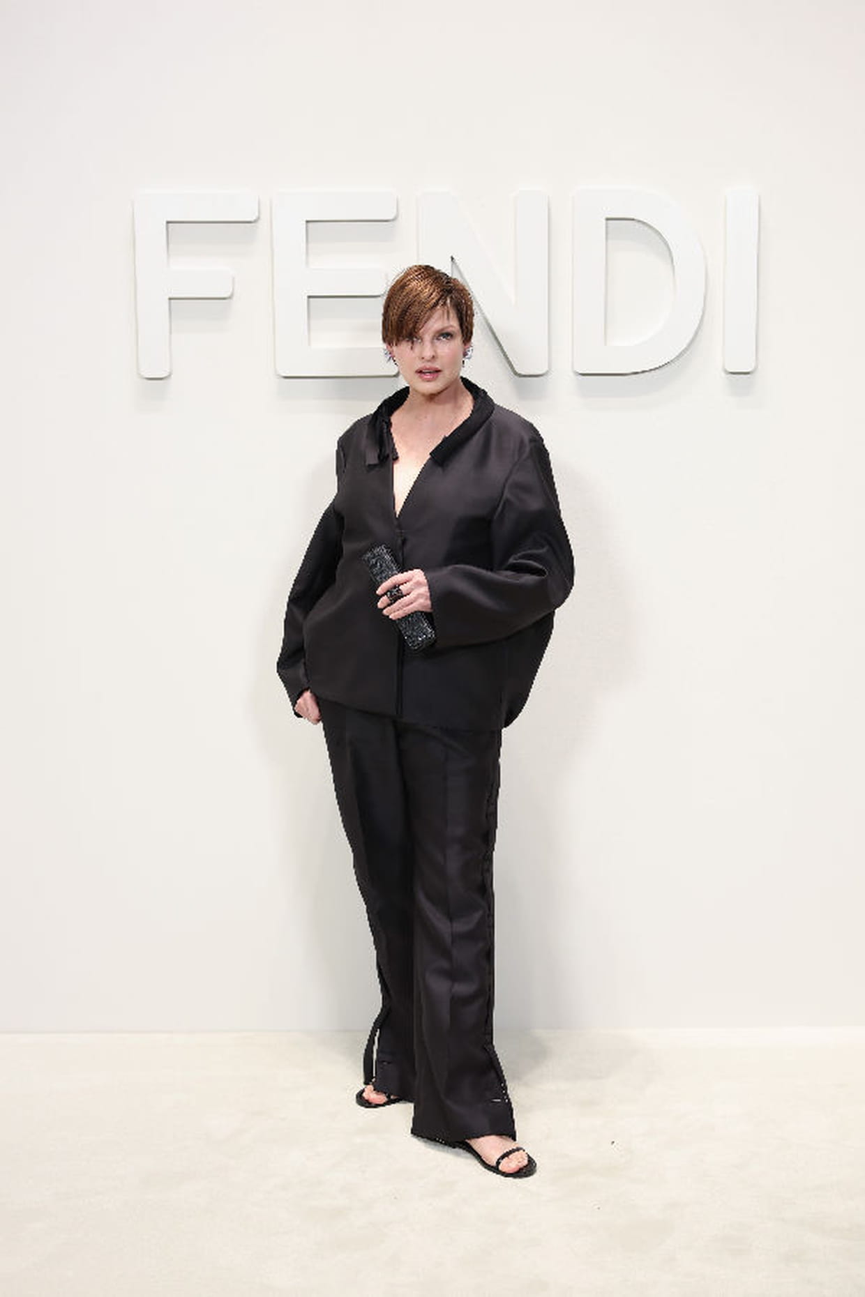 Linda Evangelista en ensemble pantalon et chemise noirs oversize au défilé Fendi printemps-été 2024 pendant la Fashion week à Milan le 20 septembre 2023.