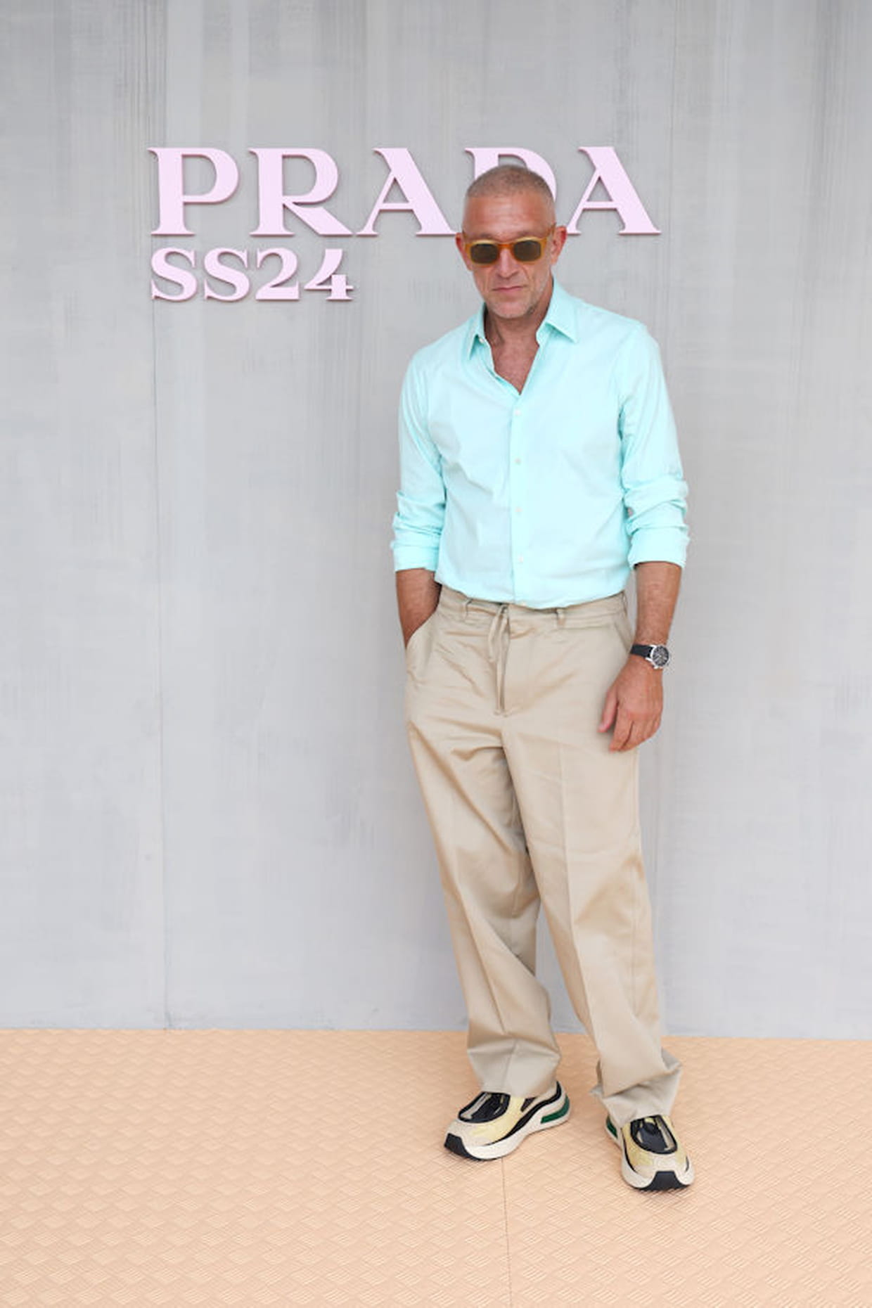 Vincent Cassel en chemise bleue et pantalon beige au défilé Prada printemps-été 2024