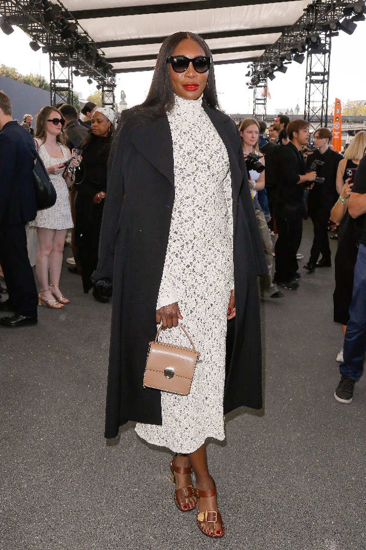 Venus Williams en robe blanche et manteau noir au défilé Chloé printemps-été 2024
