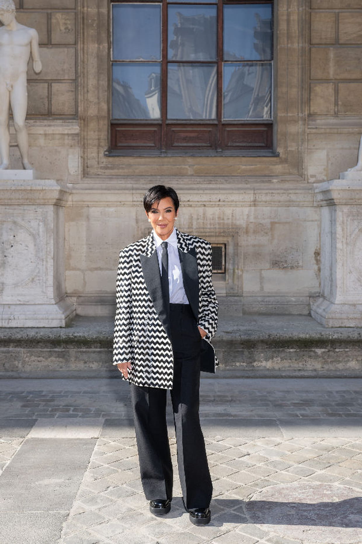 Kris Jenner en veste à rayures blanches et noires au défilé Valentino printemps-été 2024