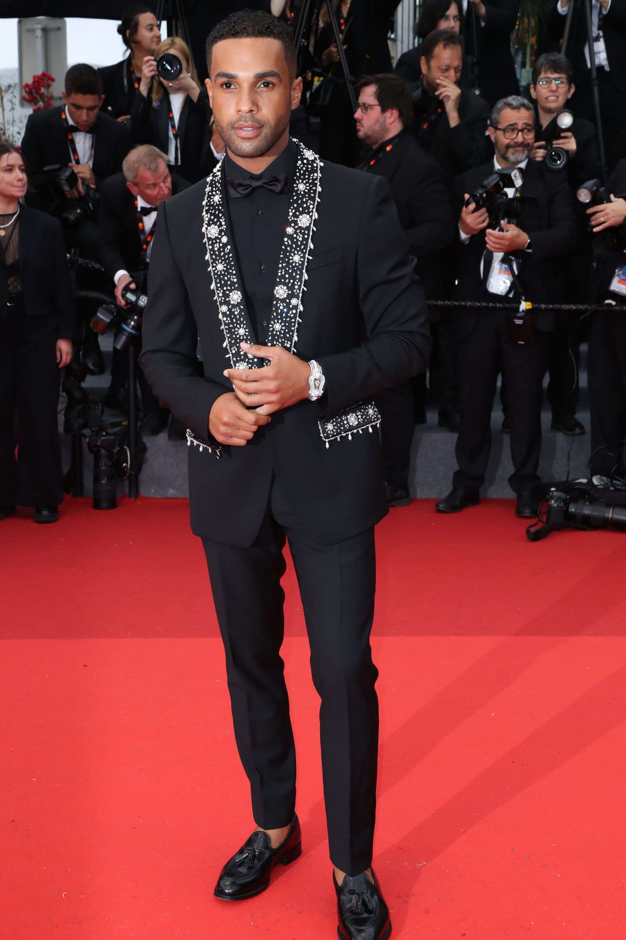 Lucien Laviscount en costume noir aux détails brillants lors de la 76ème cérémonie du Festival de Cannes le 20 mai 2023.