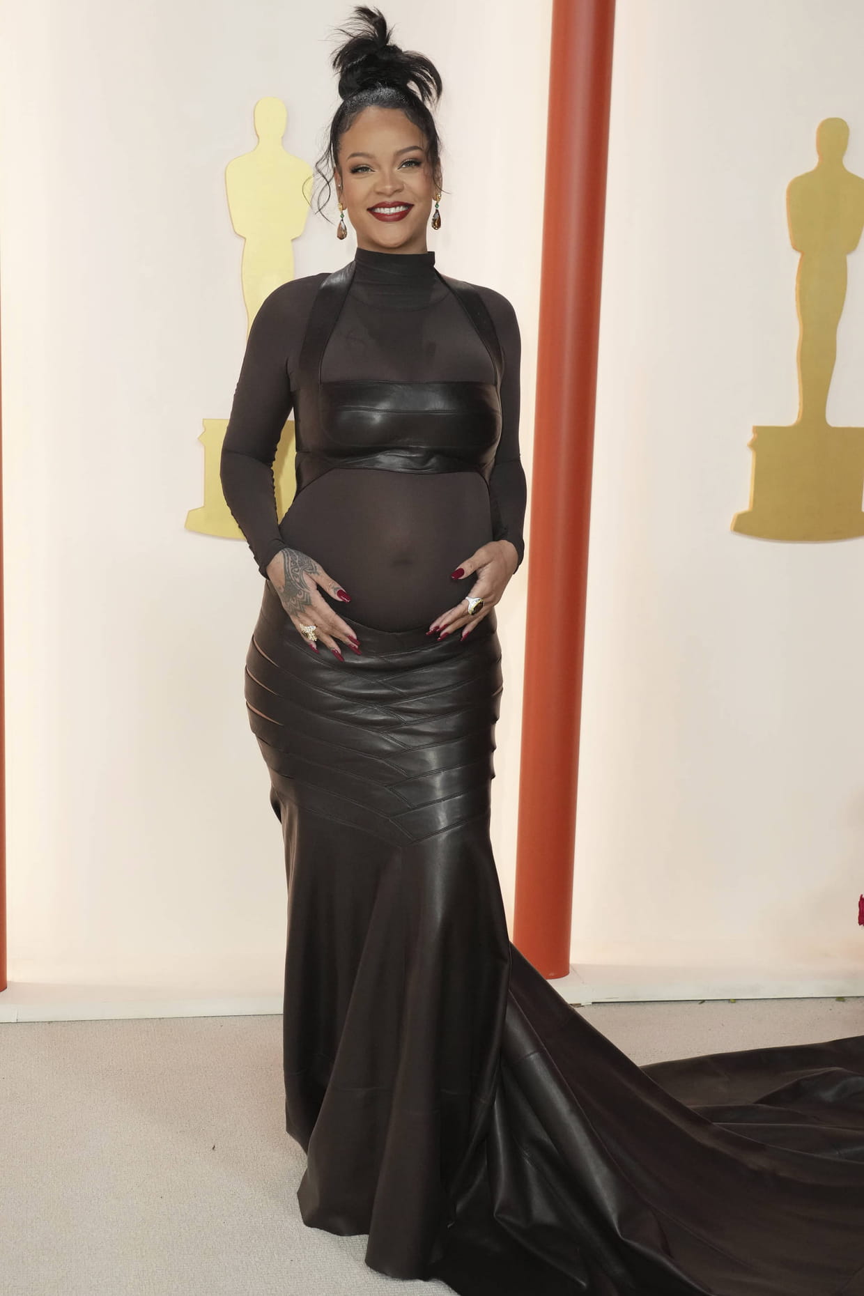 Rihanna en robe longue moulante marron lors de la 95ème cérémonie des Oscars le 12 mars 2023 à Los Angeles.