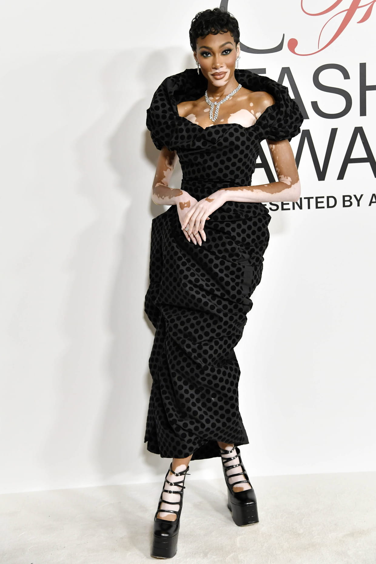 Winnie Harlow en robe rétro au col bouffant lors de la soirée des CFDA Fashion Awards le 6 novembre 2023 à New York.
