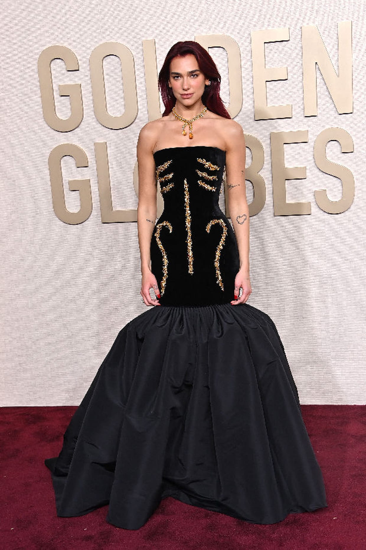 Dua Lipa en robe noire inspiration violon Schiaparelli à la 81ème cérémonie des Golden Globes à Los Angeles le 7 janvier 2024.
