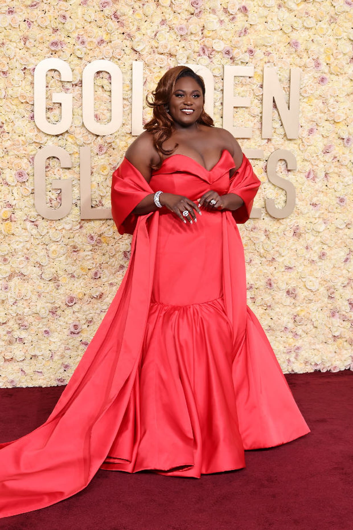 Danielle Brooks en robe bustier rouge Moschino à la 81ème cérémonie des Golden Globes à Los Angeles le 7 janvier 2024.