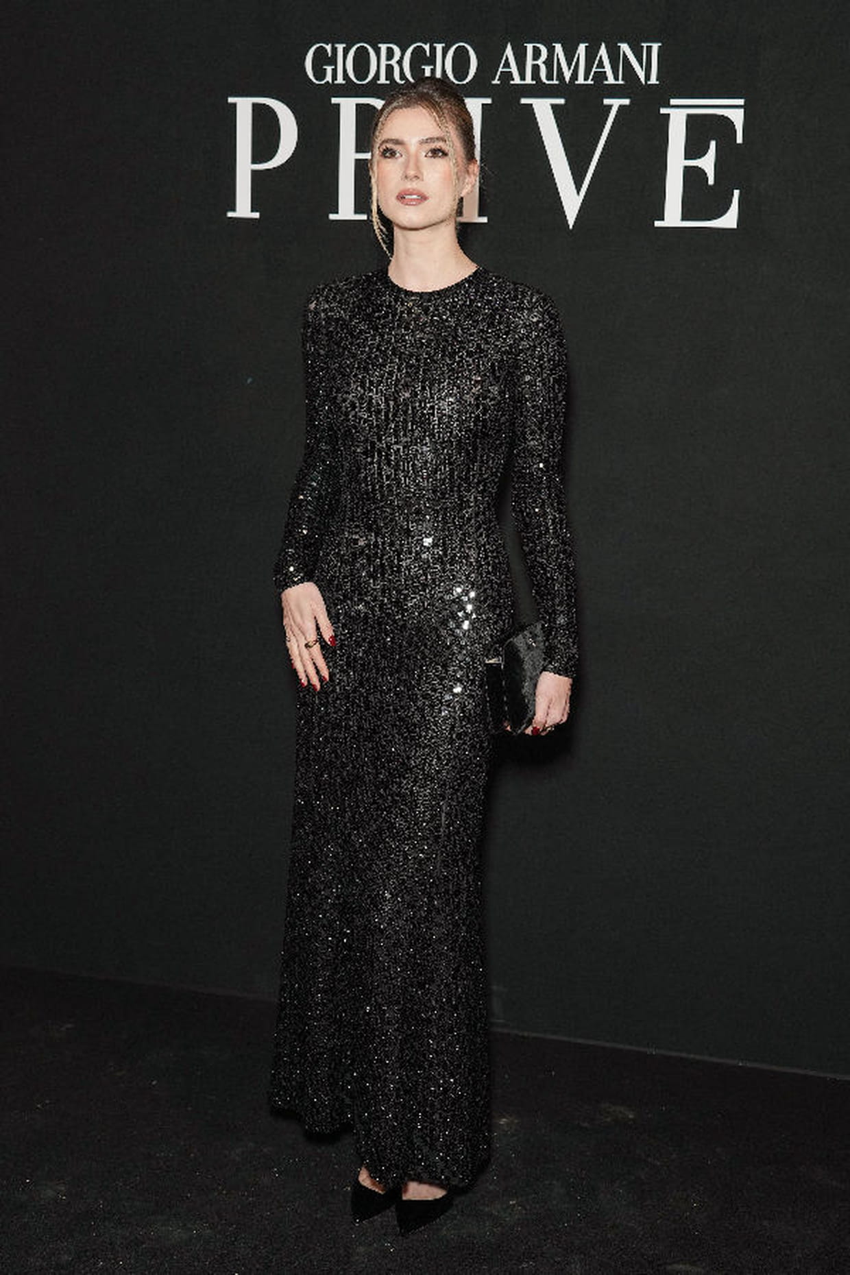 Zita d'Hauteville en robe à sequins noirs au défilé Giorgio Armani Privé printemps-été 2024