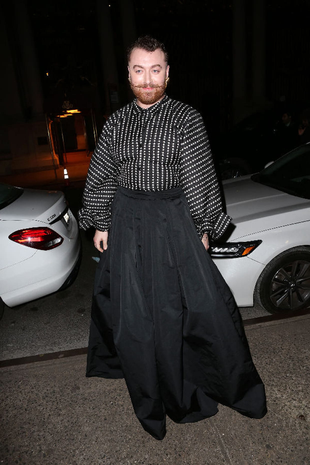 Sam Smith en chemise à pois noir et blanc et longue jupe noire