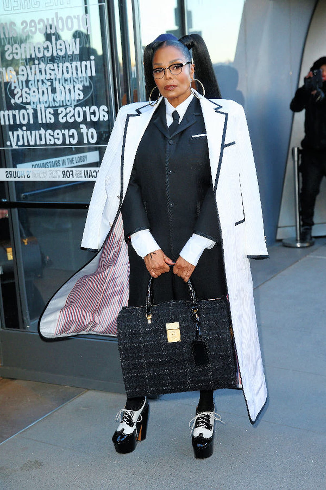 Janet Jackson en robe noire, manteau blanc et derbies à plateformes