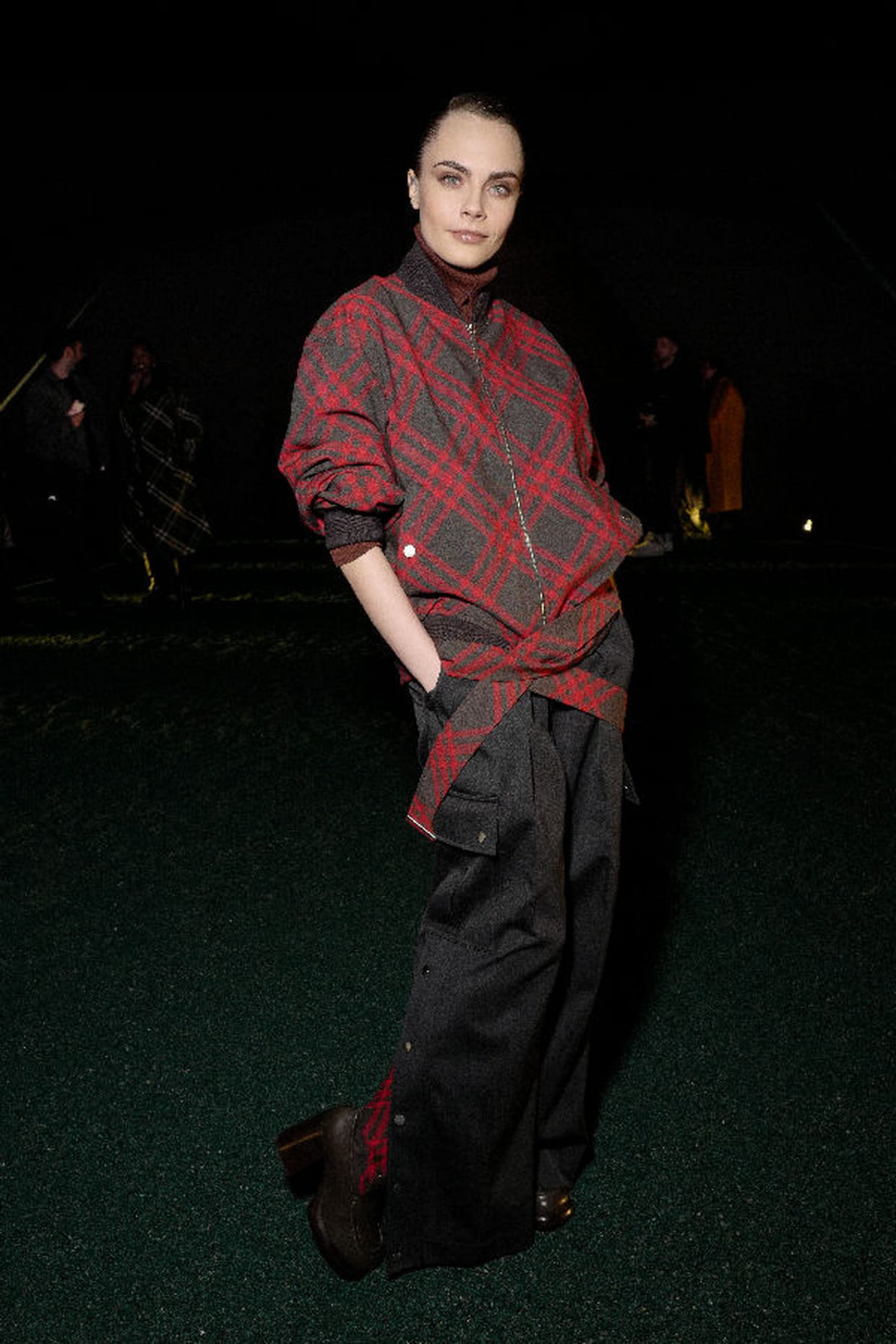 Cara Delevingne en veste à carreaux et pantalon noir au défilé Burberry lors de la fashion week automne-hiver 2024-2025 à Londres le 19 février 2024.