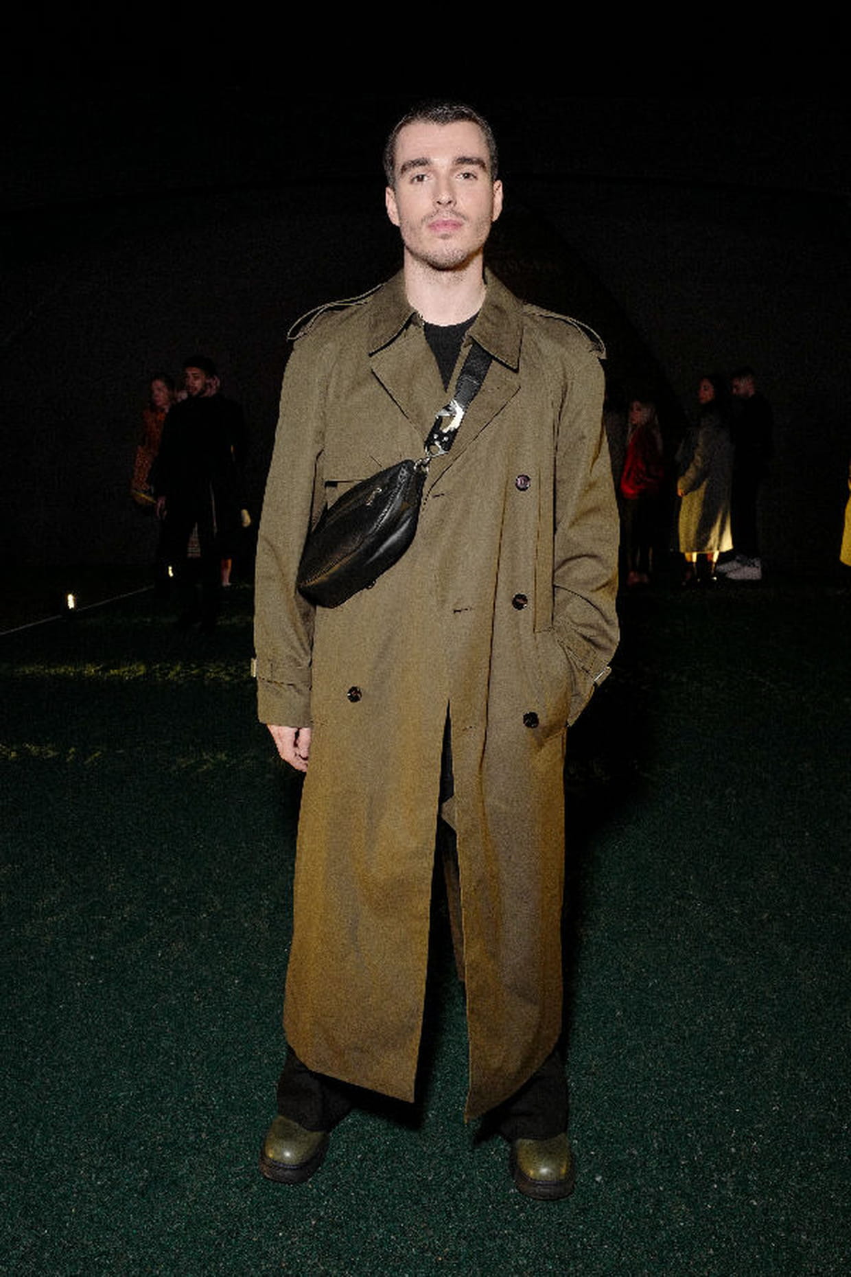 Corey Mylchreest en trench ouvert et banane noire au défilé Burberry lors de la fashion week automne-hiver 2024-2025 à Londres le 19 février 2024.