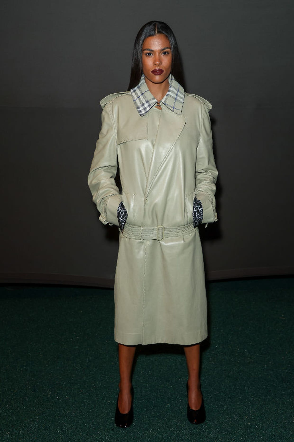 Tina Kunakey en trench en cuir au défilé Burberry lors de la fashion week automne-hiver 2024-2025 à Londres le 19 février 2024.