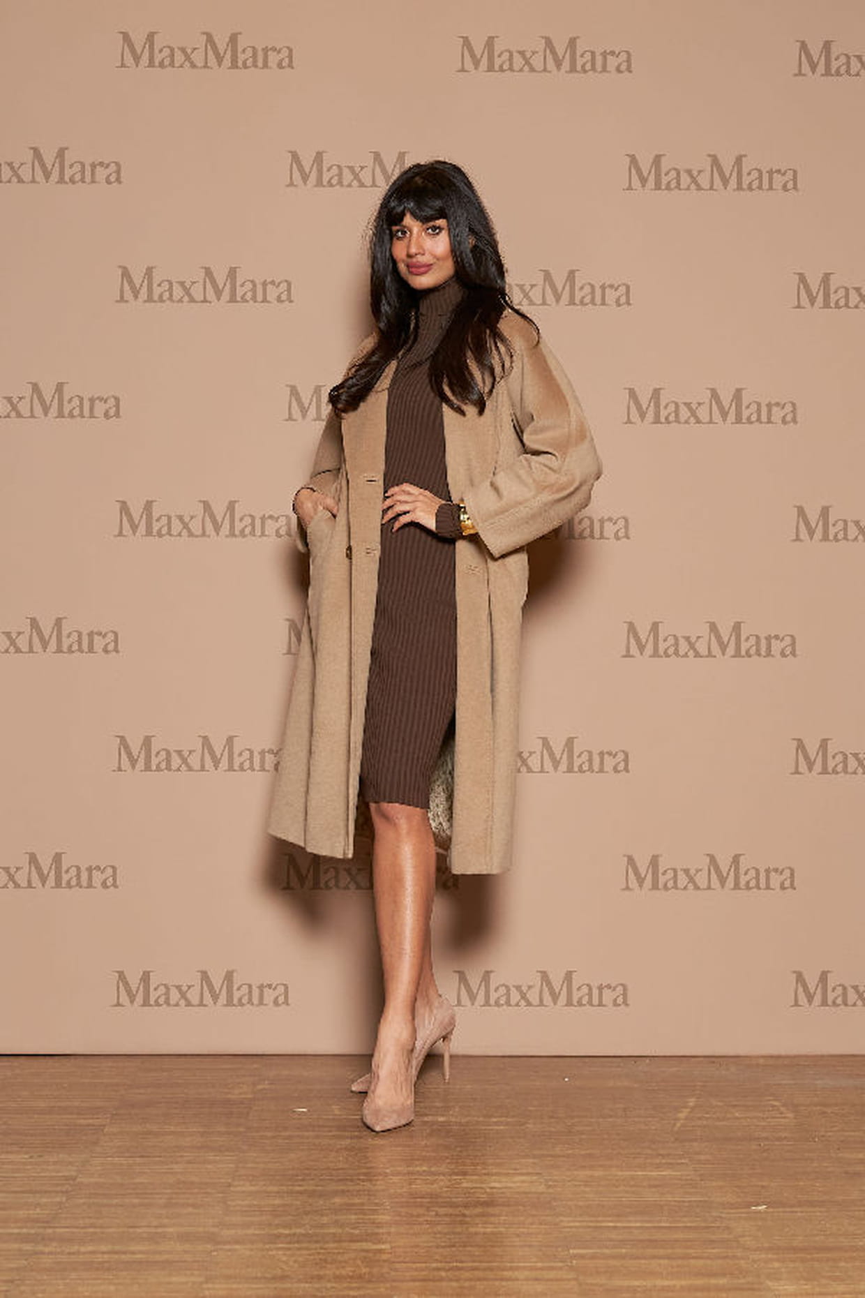 Jameela Jamil en robe moulante marron au défilé Max Mara lors de la fashion week automne-hiver 2024-2025 à Milan le 22 février 2024.