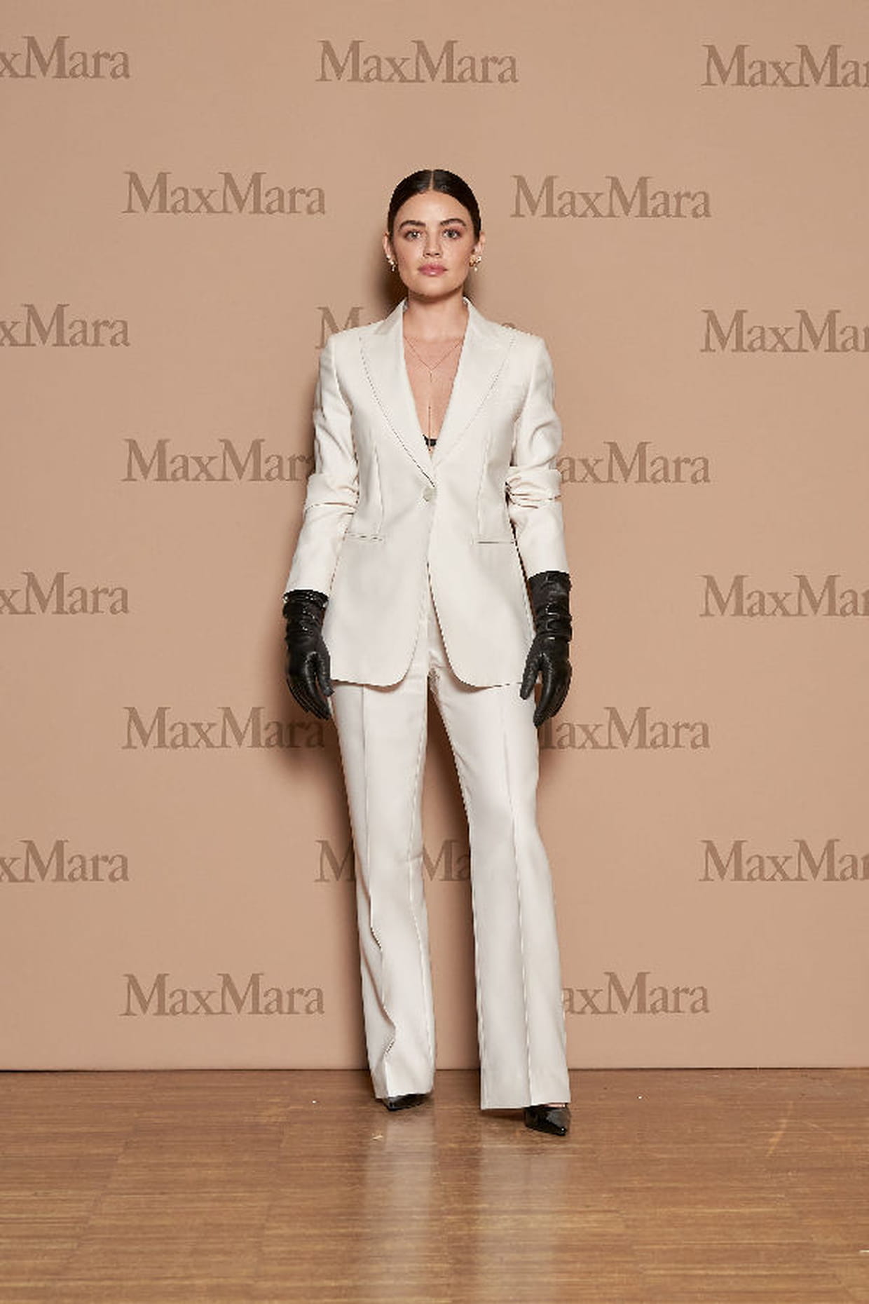 Lucy Hale en costume blanc et longs gants en cuir noirs au défilé Max Mara lors de la fashion week automne-hiver 2024-2025 à Milan le 22 février 2024.