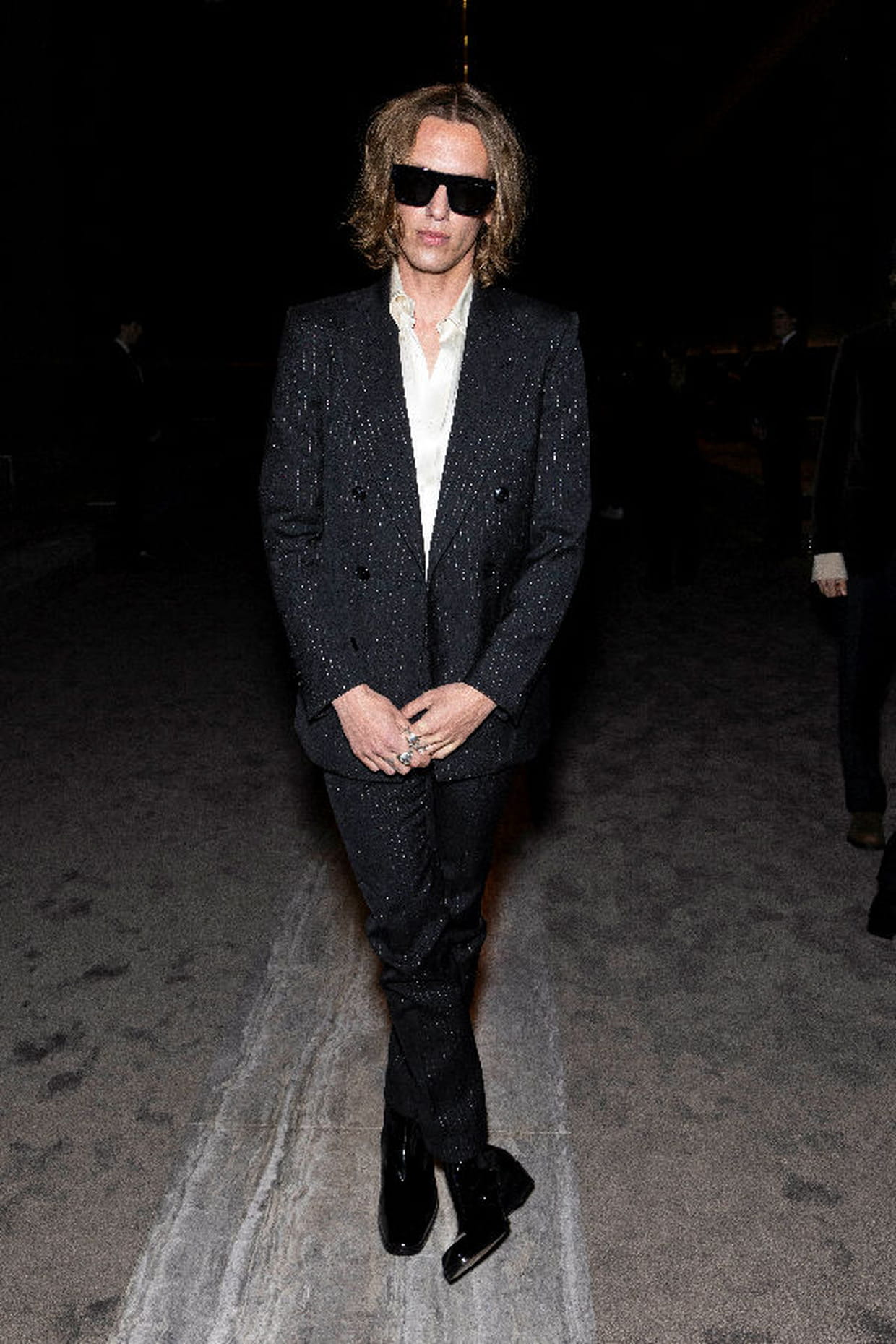 Jamie Campbell en costume noir à fines rayures blanches et lunettes de soleil rectangulaires