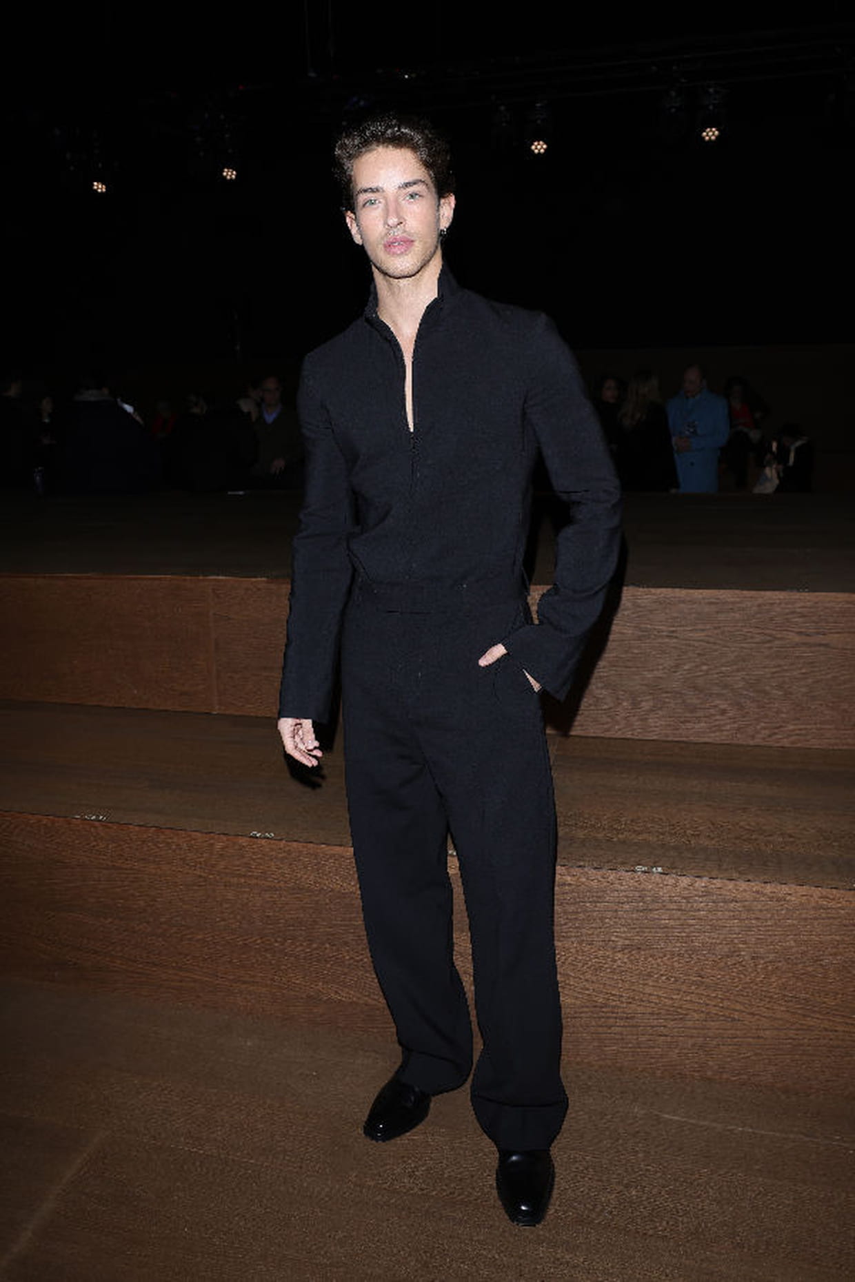 Manu Ríos en total look noir au défilé Ferragamo lors de la fashion week automne-hiver 2024-2025 à Milan le 24 février 2024.