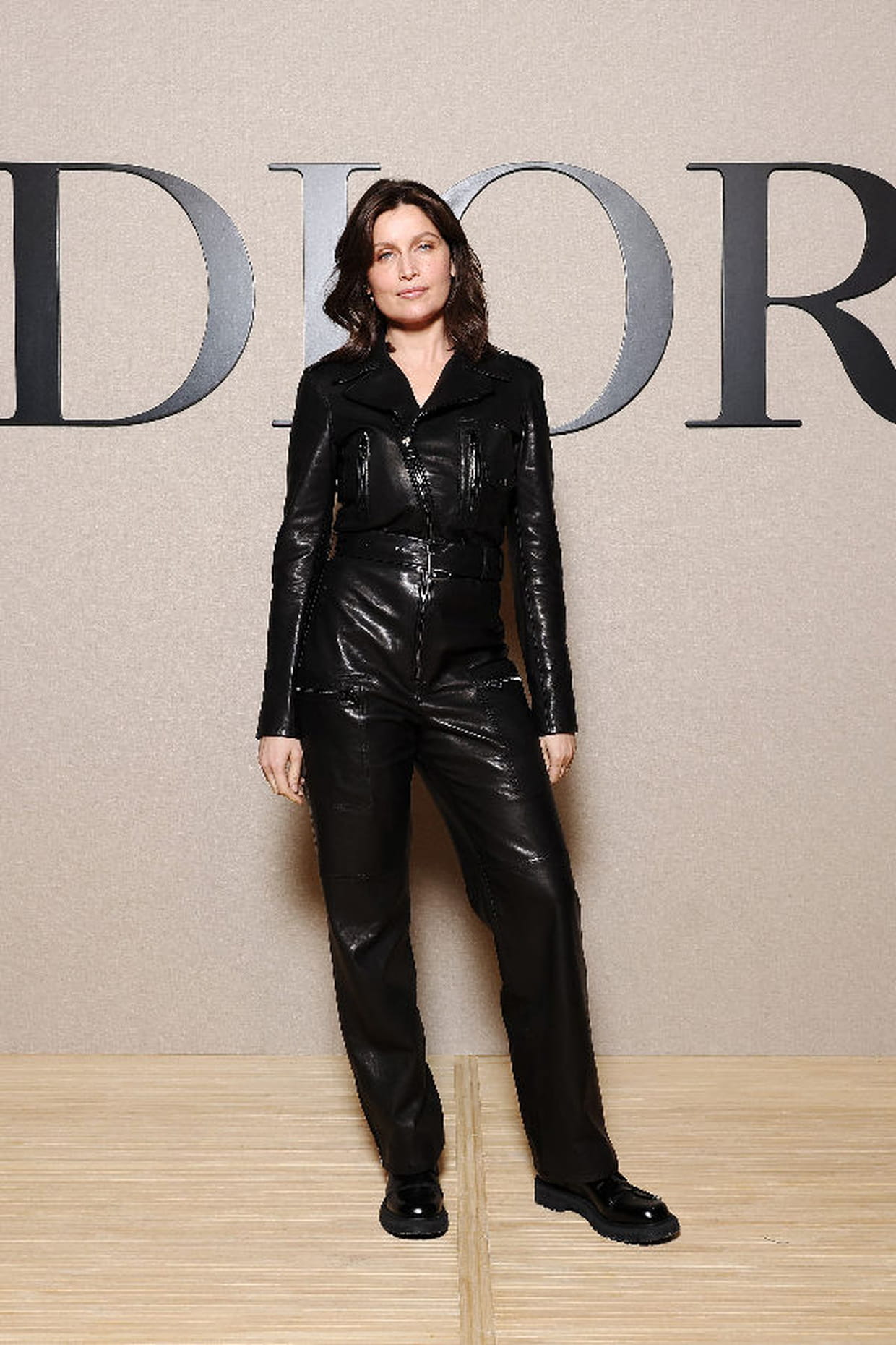 Laetitia Casta en combipantalon en cuir noir au défilé Dior lors de la fashion week automne-hiver 2024-2025 à Paris le 27 février 2024.