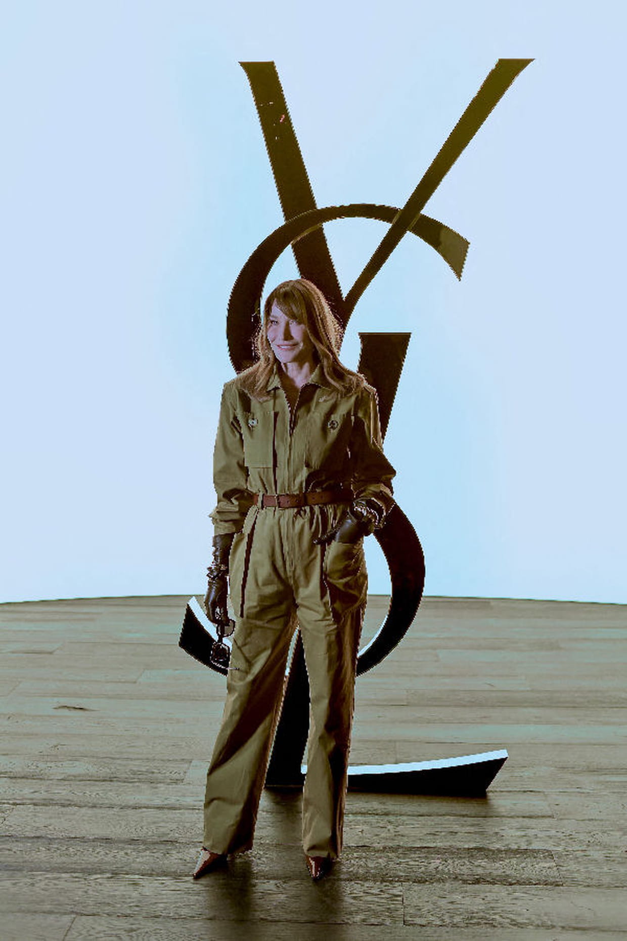 Carla Bruni en combipantalon kaki au défilé Saint Laurent lors de la fashion week automne-hiver 2024-2025 à Paris le 27 février 2024.