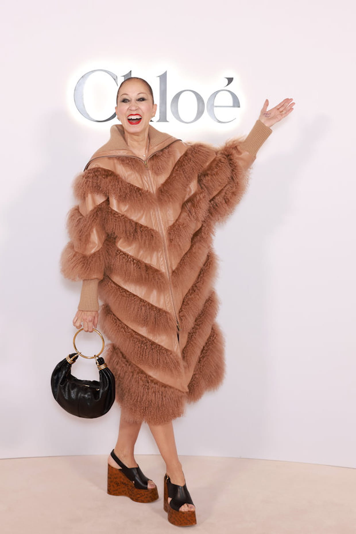 Pat Cleveland en manteau en fourrure et sandales compensées au défilé Chloé lors de la fashion week automne-hiver 2024-2025 à Paris le 29 février 2024.