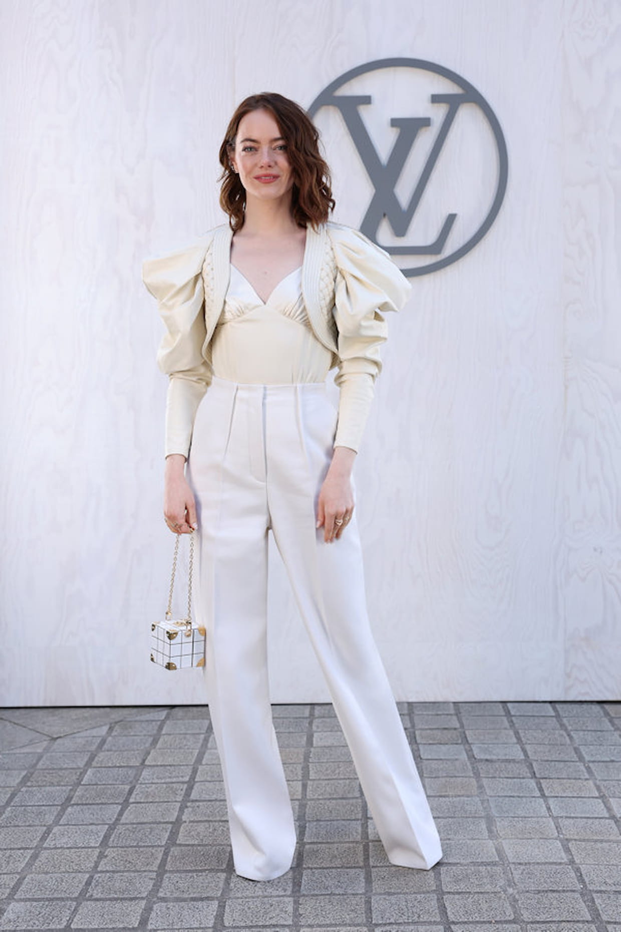 Emma Stone en blouse à manches bouffantes et pantalon blanc au défilé Louis Vuitton lors de la fashion week automne-hiver 2024-2025 à Paris le 5 mars 2024.