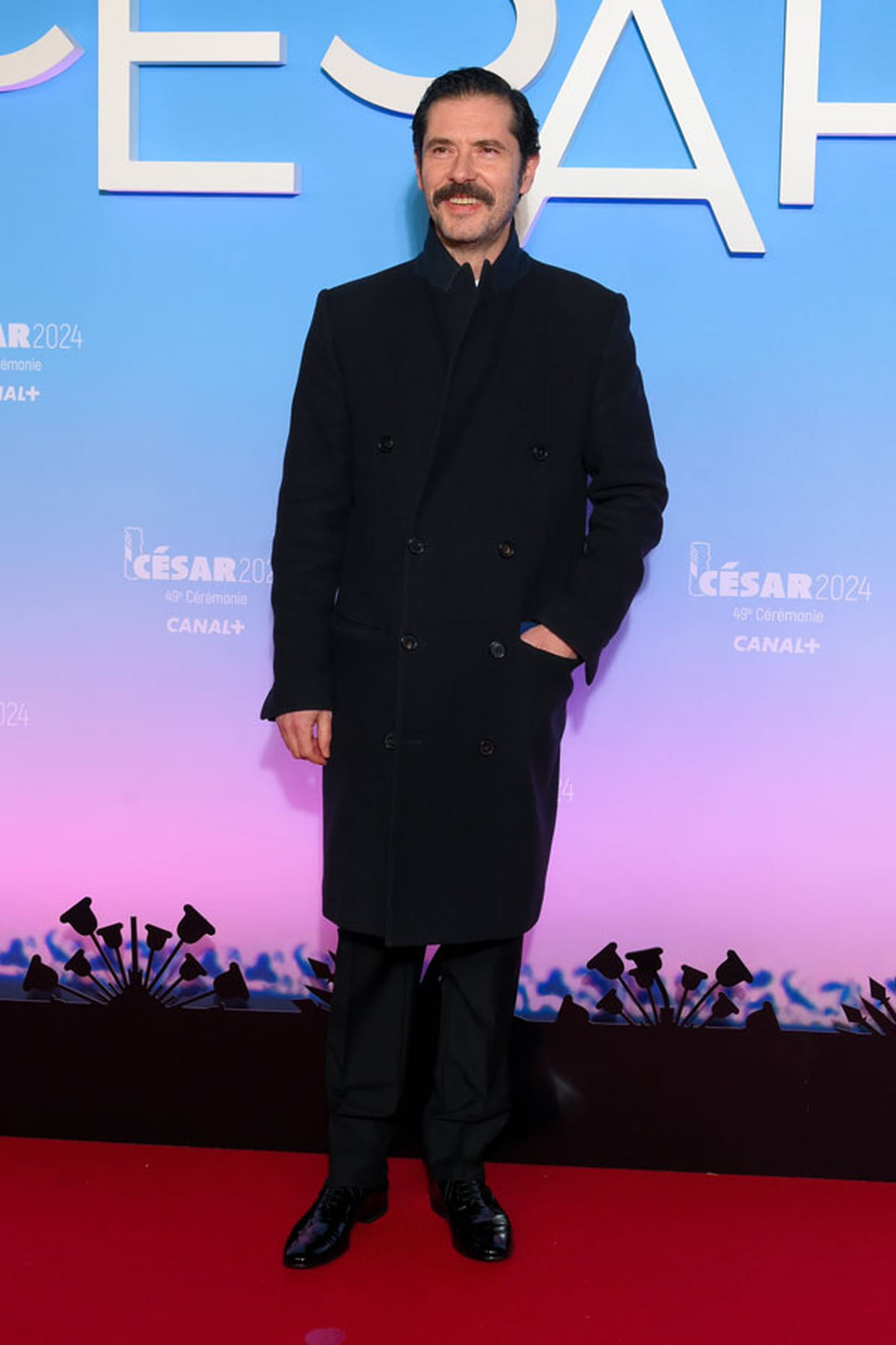 Melvil Poupaud en manteau noir façon caban à la 49ème cérémonie des César à Paris le 23 février 2024.