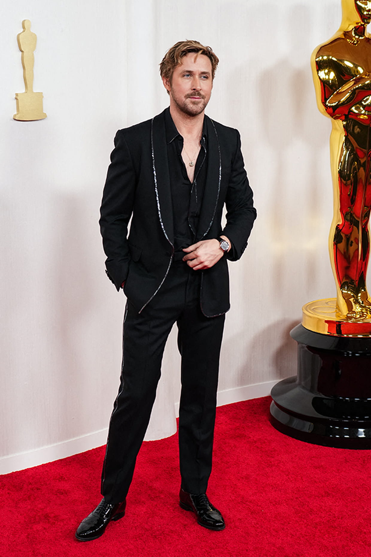 Ryan Gosling en smoking noir et chemise ouverte Gucci lors de la 96ème cérémonie des Oscars à Los Angeles le 10 mars 2024.