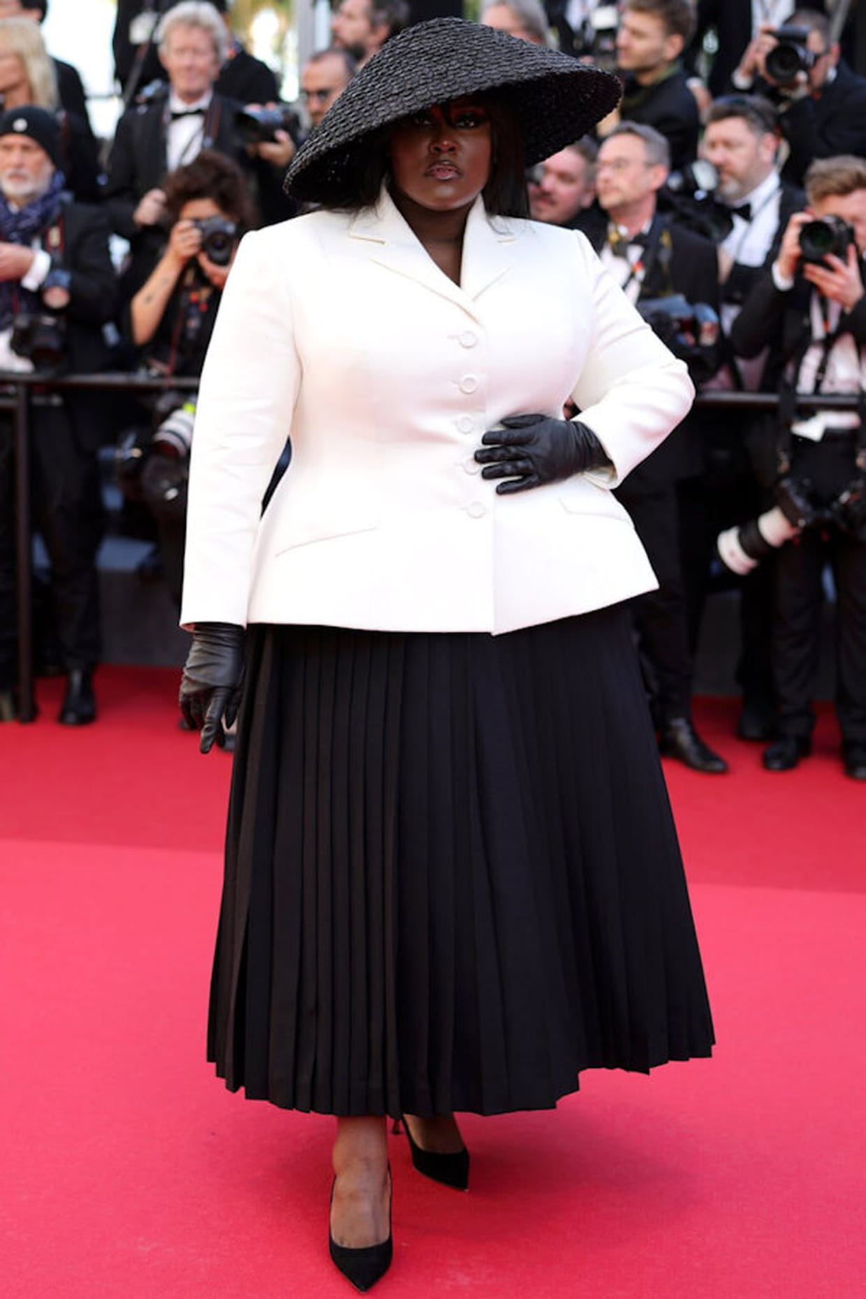Yseult en veste blanche et jupe plissée Dior lors de la 77ème édition du Festival de Cannes le 16 mai 2024.