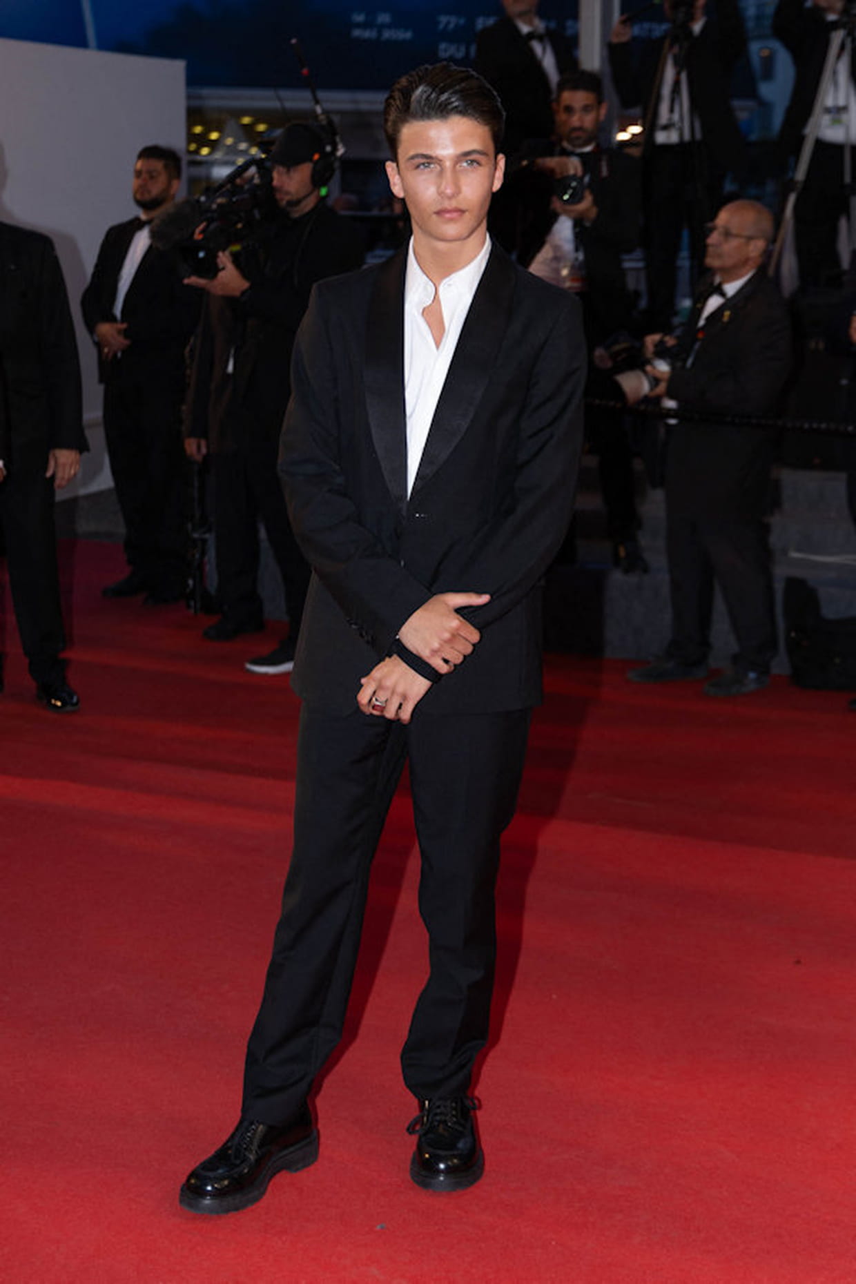 Malik Frikah en smoking noir Prada lors de la 77ème édition du Festival de Cannes le 23 mai 2024.