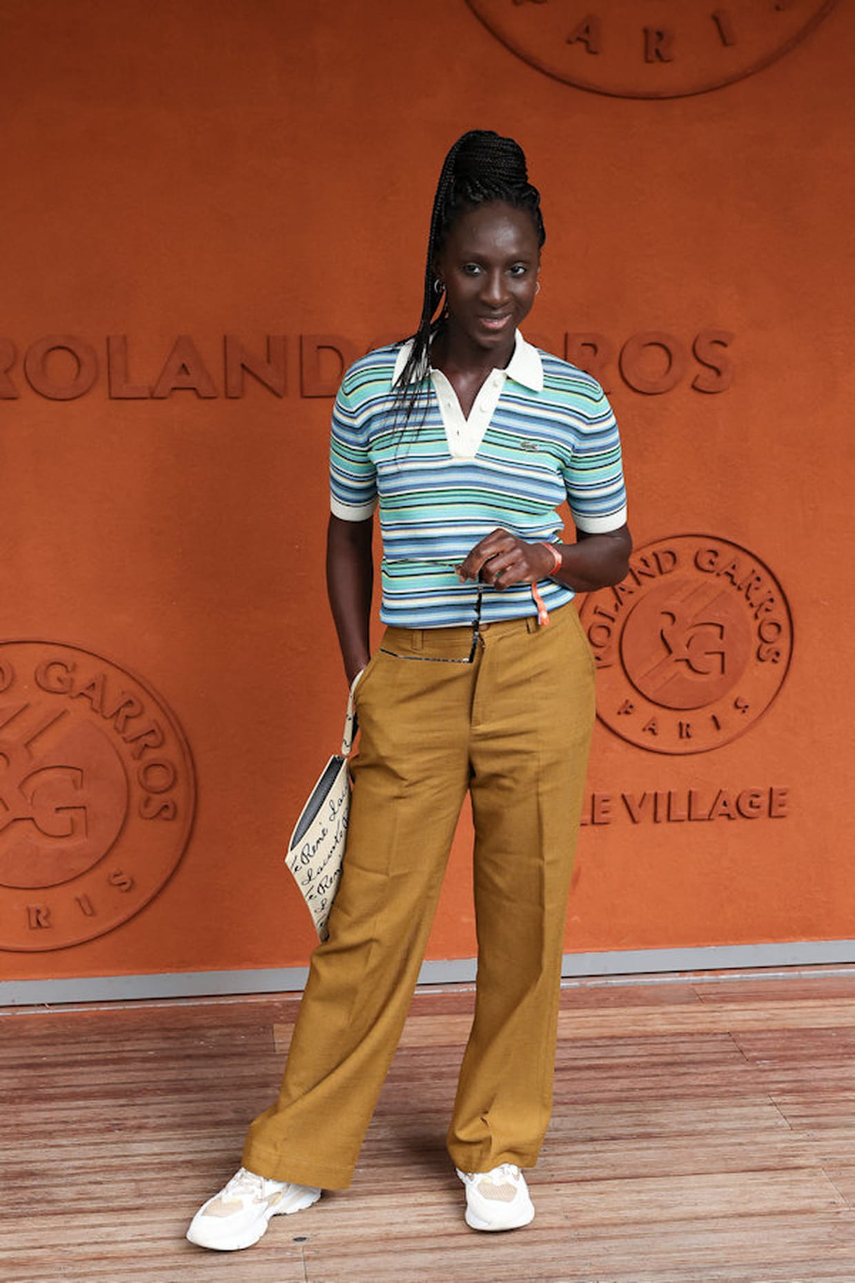 Eye Haïdara en polo rayé et pantalon camel lors du tournoi de tennis de Roland-Garros à Paris le 1er juin 2024.