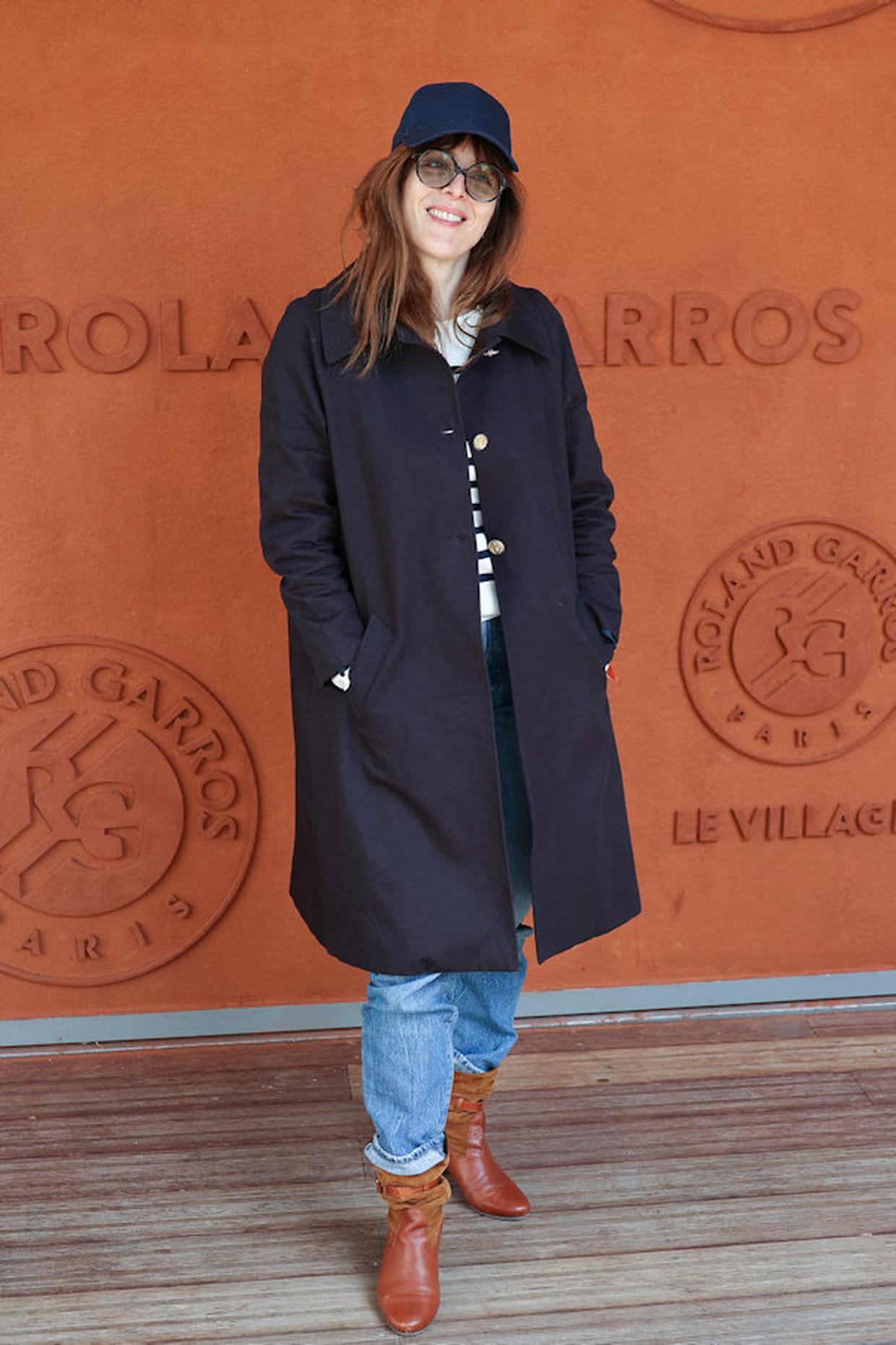 Valérie Donzelli en casquette, manteau trois-quarts et jean clair lors du tournoi de tennis de Roland-Garros à Paris le 3 juin 2024.