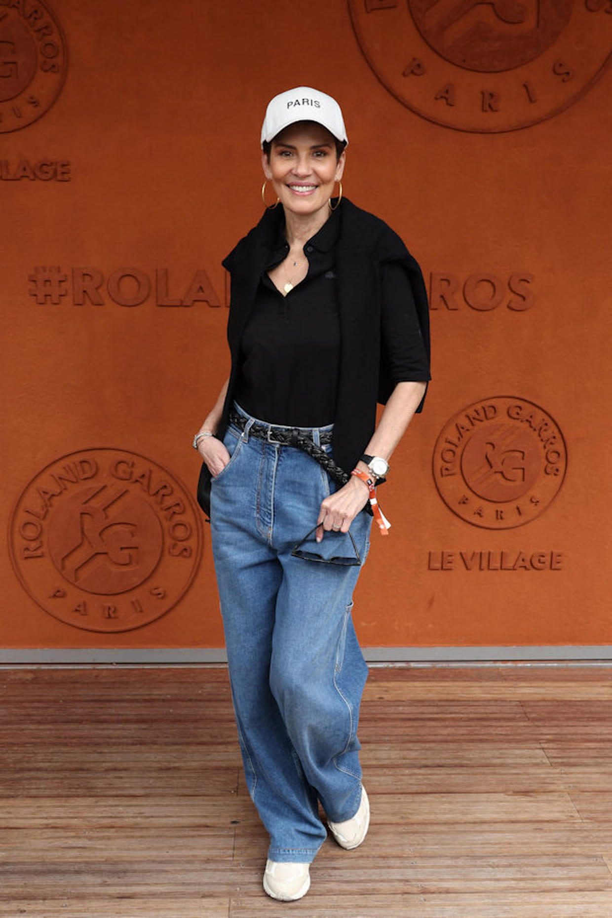 Cristina Cordula en baggy et casquette blanche lors du tournoi de tennis de Roland-Garros à Paris le 6 juin 2024.