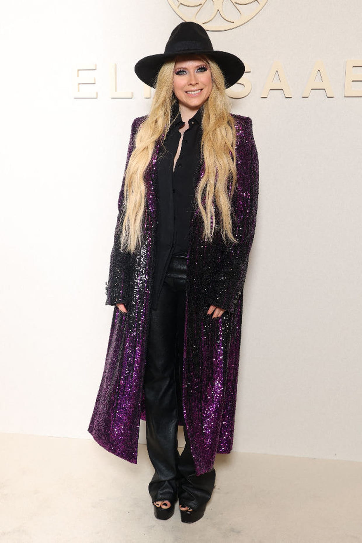 Avril Lavigne en pantalon en cuir, long manteau à sequins violets et chapeau en feutre au défilé Elie Saab pendant la fashion week haute couture automne-hiver 2024-2025 à Paris le 26 juin 2024.